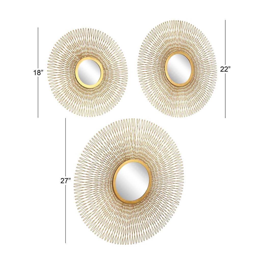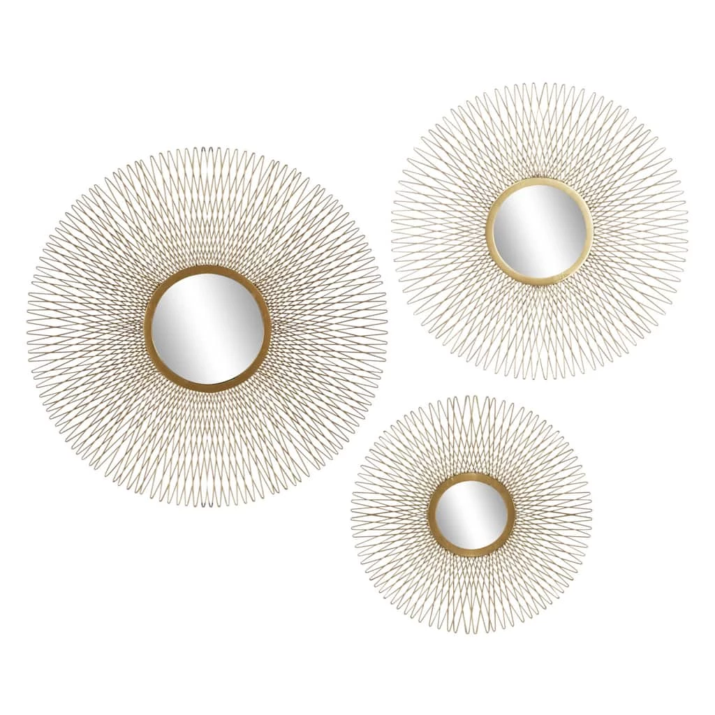 Let your glam, modern, and minimalistic-inspired home interior styles radiate all-throughout the house with this stunning trio set of golden sunburst tin wire wall mirrors! This charming dΓ©cor showcases circular iron frames with thin wires forming a radial sunburst patterned design.