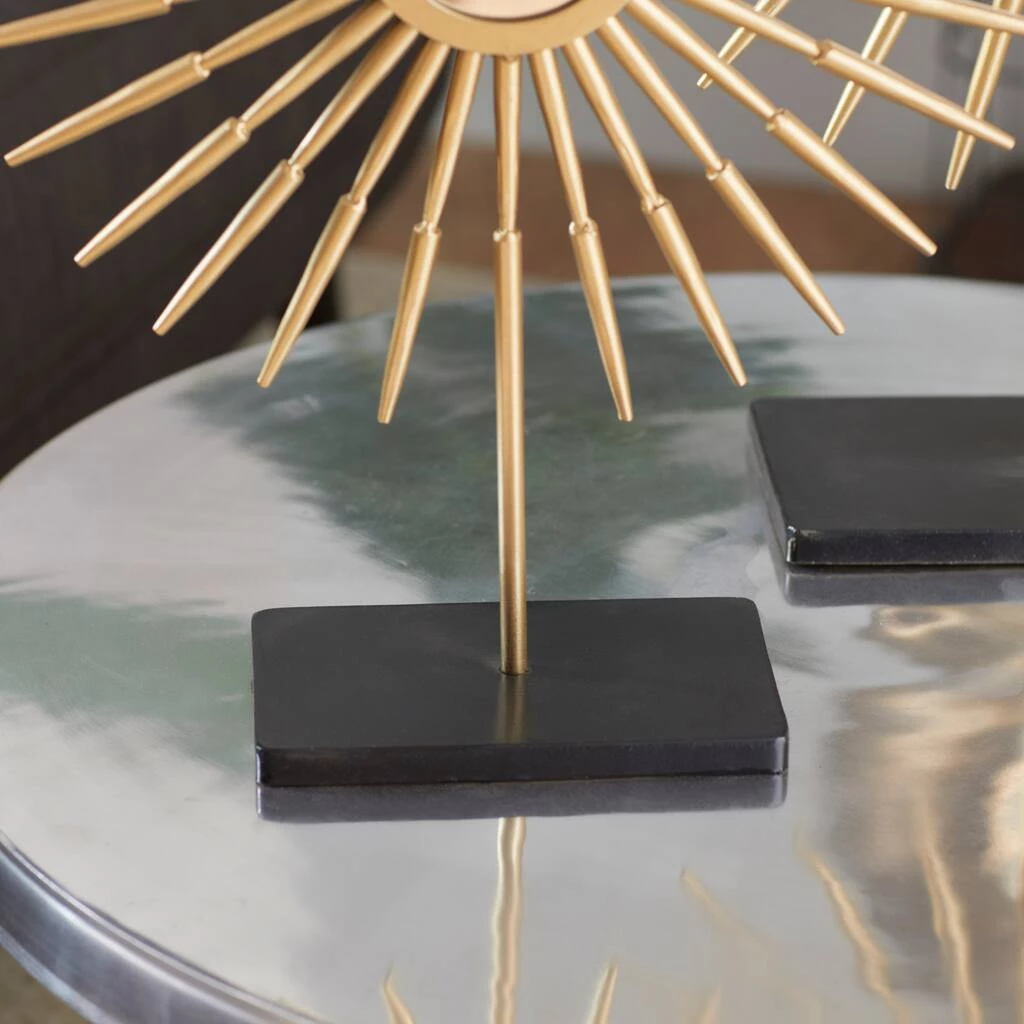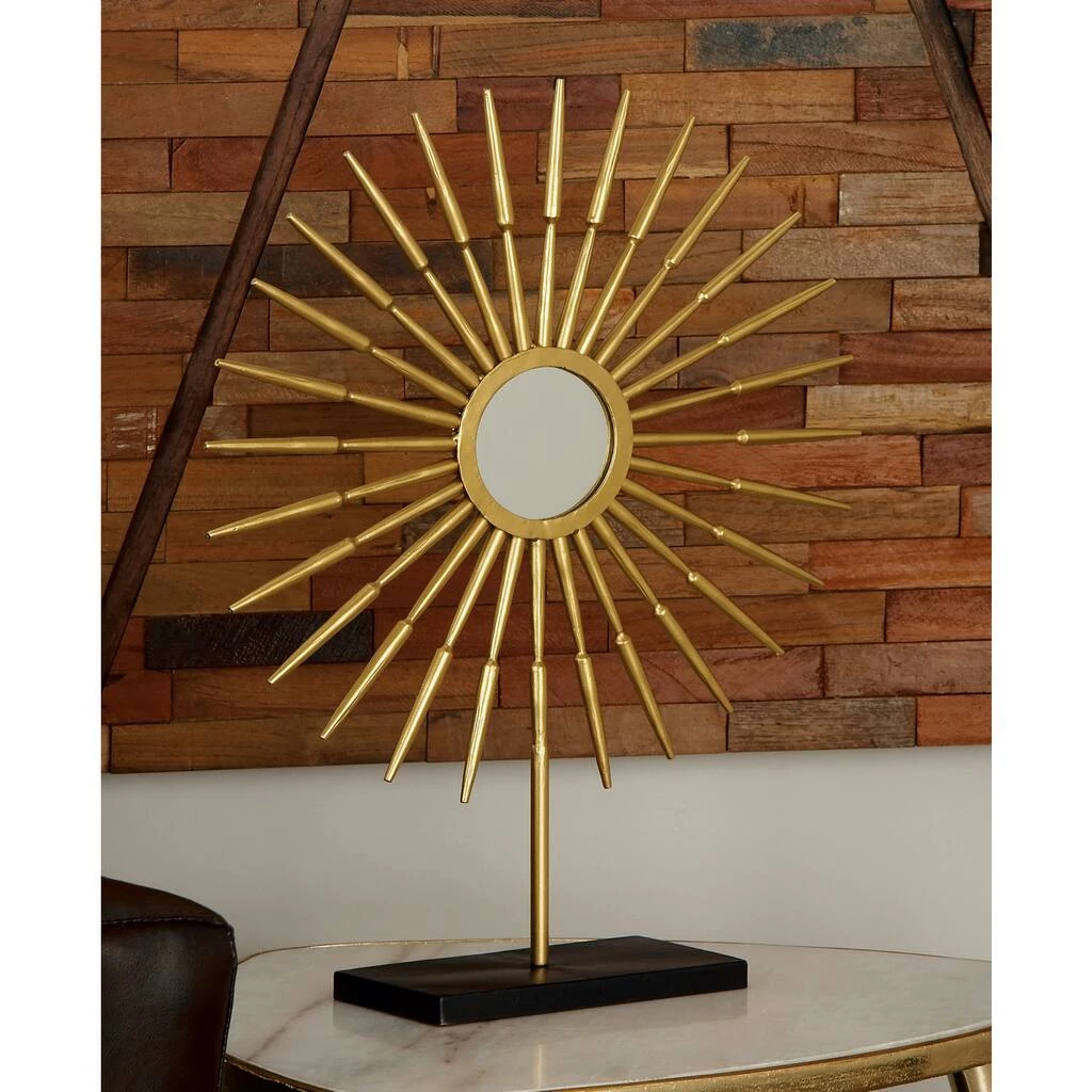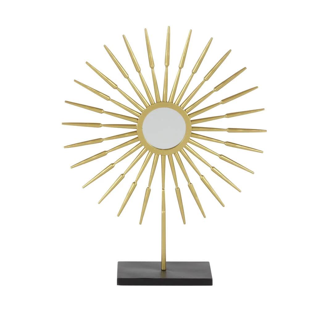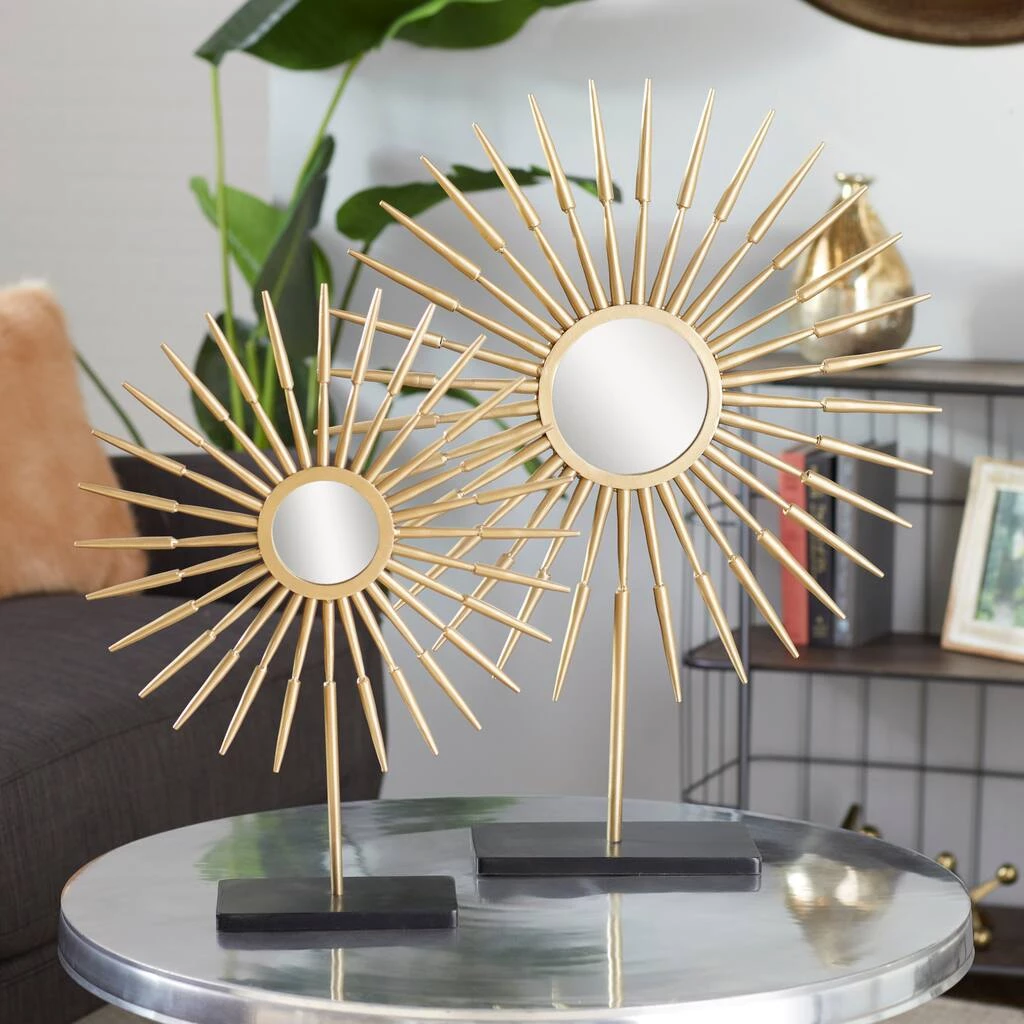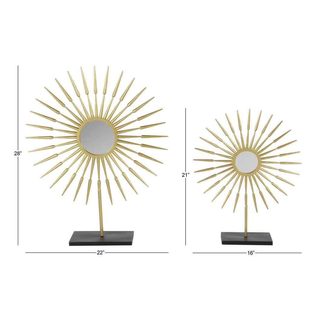 Paired together or separately, this bright Gold Tin Glam Sun Sculpture Set make fun and lively table decor in any room. One large and one small, this pair of metal spiky sun sculptures are finished in metallic gold and hold small round mirrors in the center. You can protect your walls from holes and damage with these mirrors on stands that can be displayed on any table or shelf needing a pop of gold with functional vanity mirrors. Bring your interior to life with a bounce of light coming from these table decorations, display them on dark or white consoles to best appreciate their design. Designed with stoppers at the base that prevent scratching furniture and table tops, as well as sliding around.