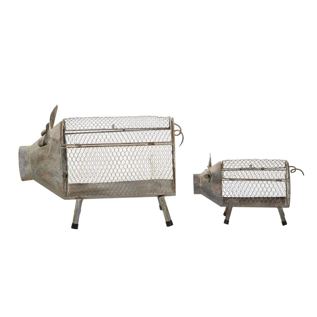 Add a touch of humor to rustic and farmhouse-inspired flowerbeds, gardens, backyards, and lawns with this Gray Distressed Metal Farmhouse Pig Planter Set. The pieces were molded with a fun loaf shape and cartoony faces to catch eyes and complement indoor and outdoor garden themes. Each piece in this garden statue set balances on four legs. Use together or separately. Distressed metal look matches with rustic and vintage garden themes. Designed with black rubber stoppers at the base that prevent scratching furniture and table tops, as well as sliding around.