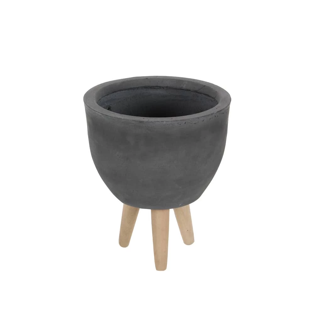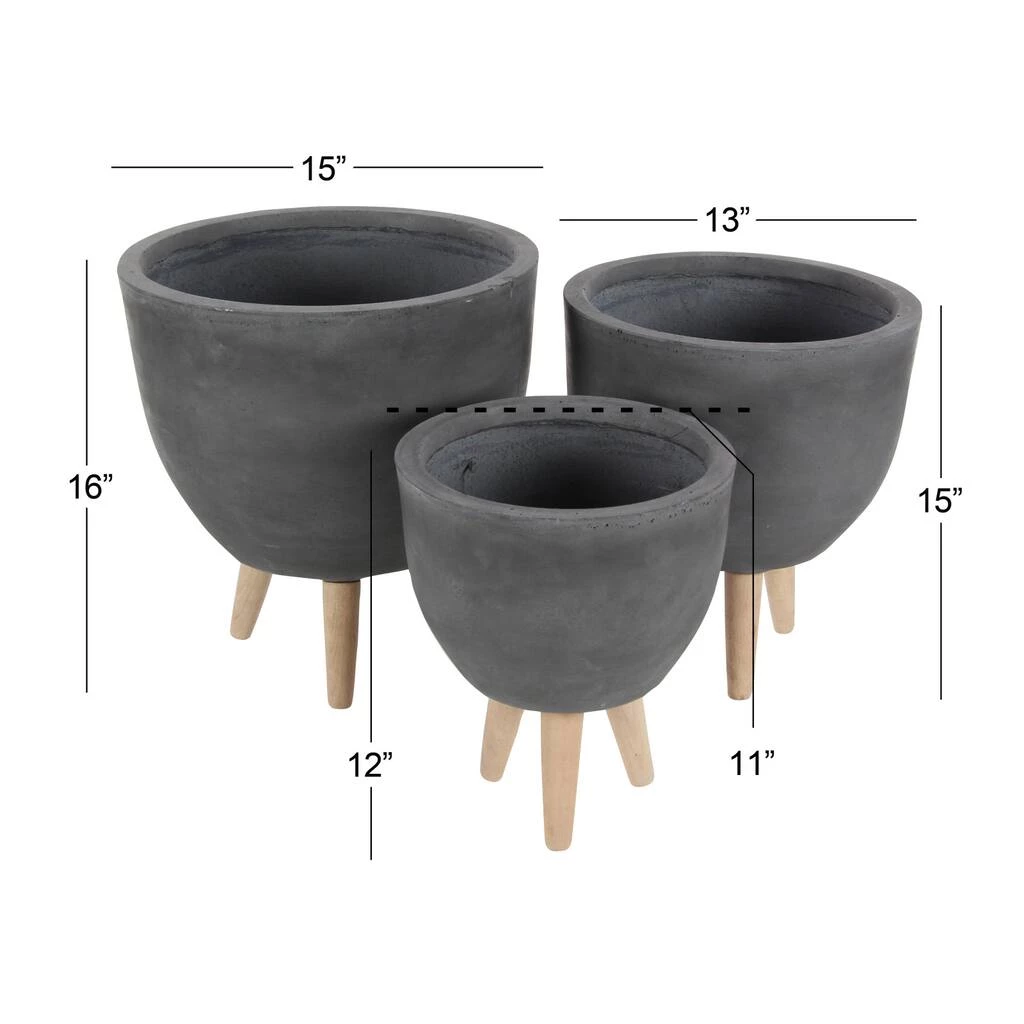 Simple yet stylish, this trio of large round plant stands are crafted from weather-resistant fiber clay in a textural matte charcoal gray finish. The large, round planter body features a deep drum shape with a wide mouth to accommodate your larger plants or to create a large surface area to plant multiple succulents or cacti. The 3 short, light beech wood legs have a mid-century look and prop up your planter for elevated display. Inside or outside, this gray planter set makes stylish contemporary and modern accent decor with neutral clay and natural wood finishes that will work with any color palette.
