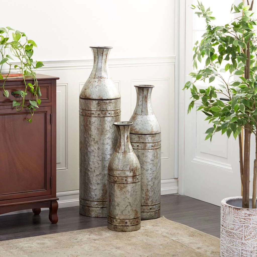 Add bold, rich texture to your space with this set of silver, hammered metal, large floor vases. With an almost medieval flair, the hammered iron reflects light beautifully along its distressed, tactile texture and elegant, cylindrical silhouette. Each vase features a fluted neck with vertical lines for added angular texture, antiquated rust effects throughout the body, and dimensional ribbed bands wrapping around the top and base, each encompassing decorative, riveted bolts. The two largest vases have detachable tops, removed by simply turning and unlatching, so they are truly versatile floor vases in both style and function.Β