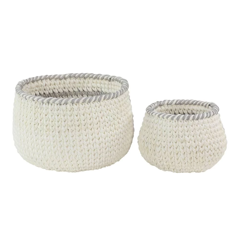 Intricate textures and unique style fill out these hand-woven, large, round, amphora-shaped storage baskets. These round baskets are handmade from thick white cotton ropes covered in clear and dark gray mesh, then intricately woven into a diagonal weave pattern, creating a gray and white chevron design block on one side of the body, a solid white block of color on the opposite side, and a striped pattern around the rim. The ropes interlock into layers of smooth checkered knots throughout the basketsβ amphora-shaped bodies with no handles, creating a pot silhouette. The soft curves and gray and white tones perfectly suit any eclectic-styled or vintage decor space that likes the look of chevron patterns and color blocks.