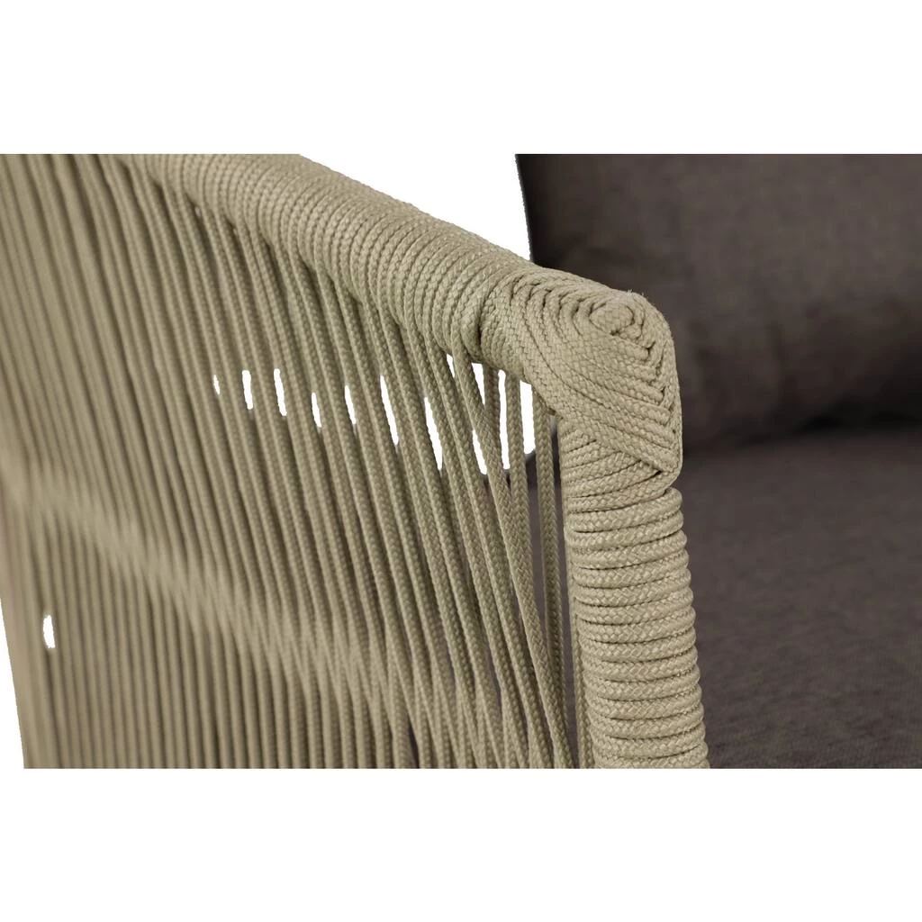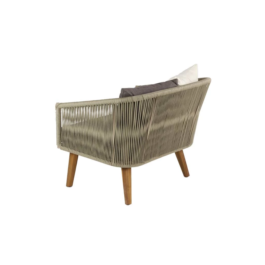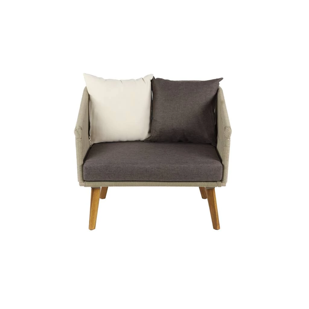 This outdoor furniture chair with cushion and pillow can be displayed and used on its own in the garden, patio, poolside, or veranda. It also matches with neutral and wood outdoor tables. This comfortable and stylish chair will be a great addition to your dining and patio bar space. The curved back and armrest with cushion seat provide optimal all day support. Designed with black rubber stoppers at the base that prevent scratching furniture and table tops, as well as sliding around. This item comes shipped in one carton. Use water with simple cleaning solution on the wooden legs and wipe dirt off with a soft cloth, rag or paper towels. Cushions should be stored indoors when not in use. The fabric will fade over time, be sure to turn cushions regularly to equalize the color change. Polyester cushion cover is removable and machine washable with soap and water. Suitable for indoor and outdoor use. Some assembly required. Maximum weight limit is 250 lbs. Made in Vietnam. Use water with simple cleaning solution on the wooden legs and wipe dirt off with a soft cloth, rag or paper towels. Acacia wood, aluminum and PP rope are highly durable and are all resistant to water. Modern design.