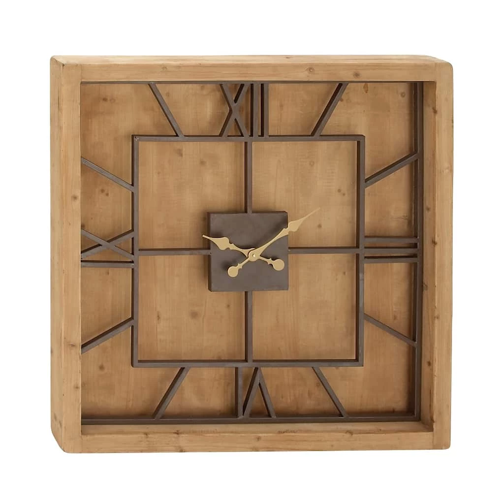 Time is of the essence, no matter where you are. And what better way to stylishly keep track of time at home than this oversized clock. The open-faced clock features a metal clock face in deep brown finish and gold hands. The clock is then mounted on a square Chinese fir wood frame with a natural brown finish. This wall clock is an excellent time-keeping accent in modern and natural and farmhouse themed homes.