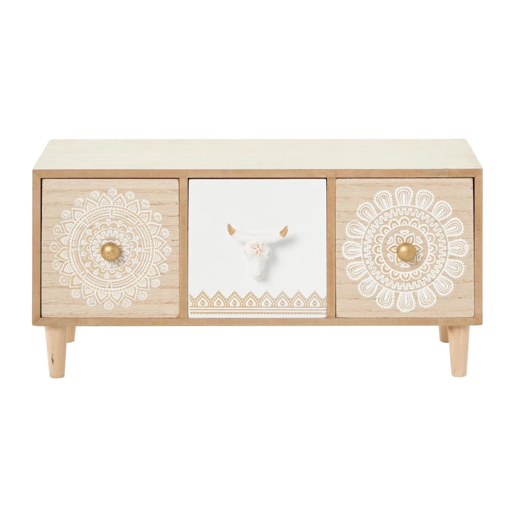 This rectangular wood jewelry box with legs has a mid-century modern style with detailed eclectic mandala patterns painted in white over two of the light natural wood drawers with metallic gold round handles. Complementing other boho chic or eclectic bedroom dΓ©cor, even more funky style is added with a decorative hand-painted bull skull handle on the center drawer. The large bull skull handle features gold horns and an orange flower over the center of its forehead. The neutral tones will work beautifully with bold, bright colors or softer tones and patterns, alike.