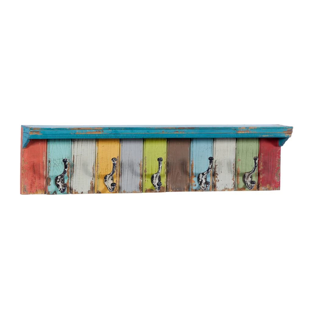 Add splashes of fun color with the convenience of display and organization in this colorful wood wall shelf with a 5 hook rack. Vertical planks of distressed fir wood are painted in bold colors, including vermilion red, aqua, white, yellow, gray, chartreuse, brown, sky blue, and poppy red. Five of the planks have large distressed black and silver metal hooks to hold and display light coats, keys, and home decor. The top of this floating shelf rack has enough space to display plants and books bring fashionable function to your wall with pops of color. This item comes shipped in one carton. This item hangs via backing hardware. Suitable for indoor use only. Each hook holds 5 to 8 lbs. Coastal design.