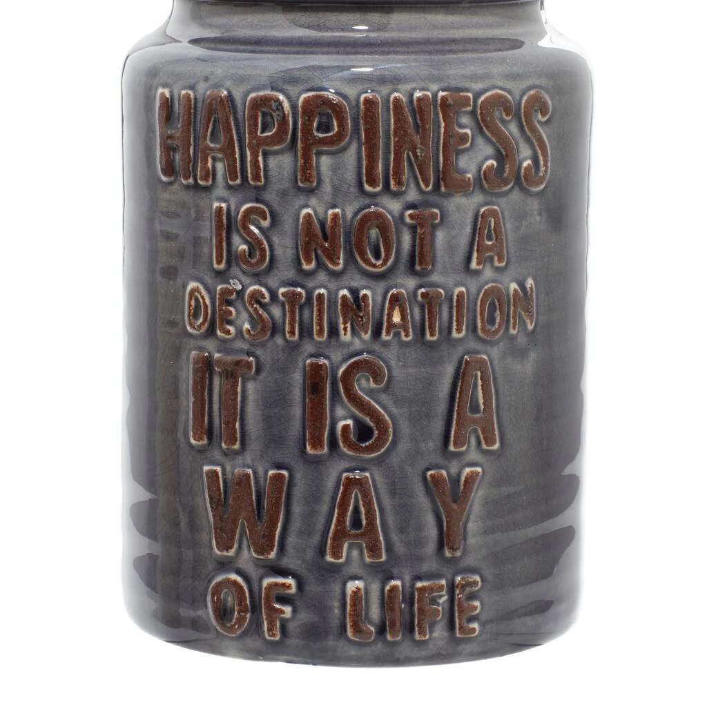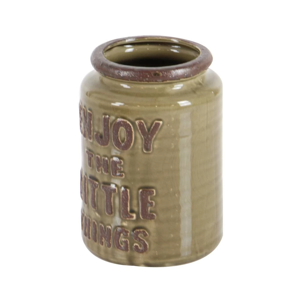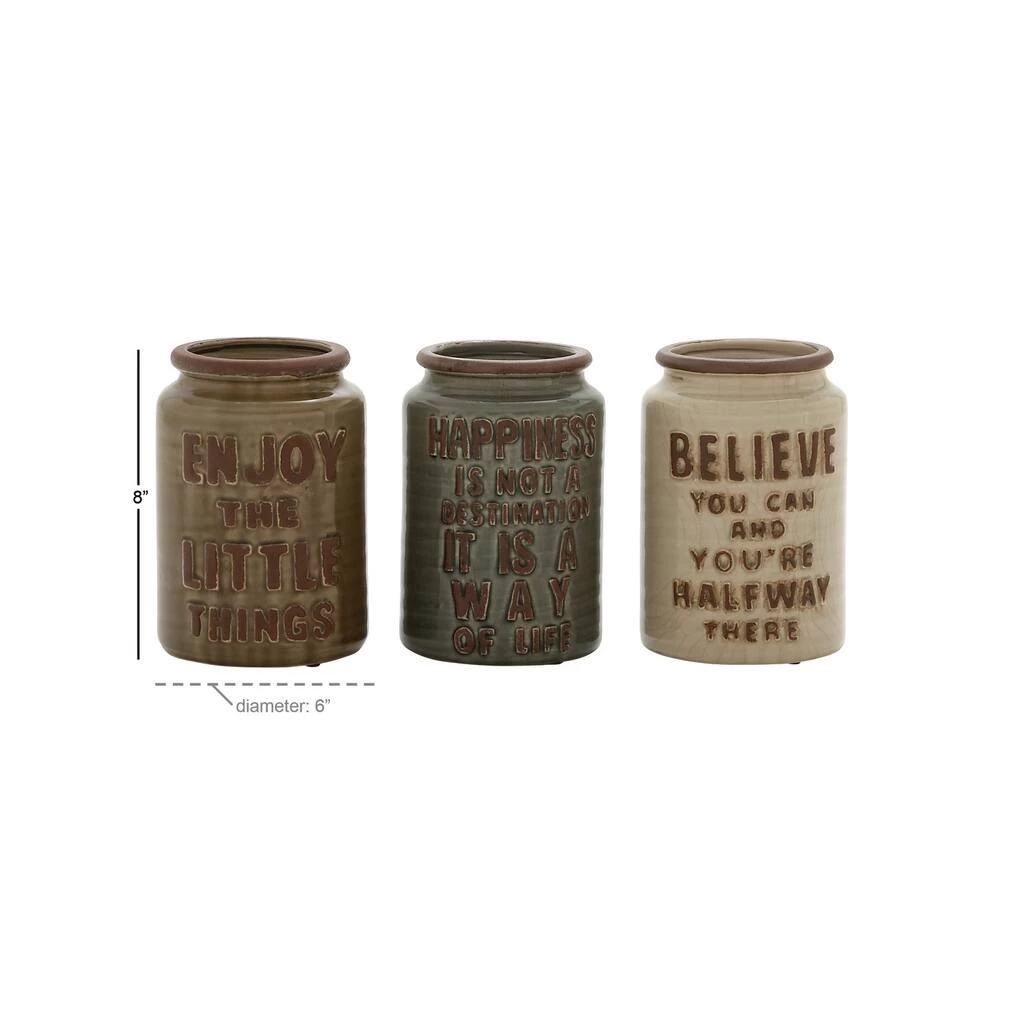Use this Buy this Multi Colored Ceramic Vintage Jar Set to create a focal point over your accent table, countertop, shelf, or mantel.Β Each jar contains an embossed inspirational sign/motto in the “Enjoy Believe Happiness” series.Β Display these earth colored cutlery jars as a set in your kitchen to segregate utensils or use them individually as decor pieces around your home for a blissful vintage vibe. Let these accent pieces provide a sense of style to your home by displaying them on top of a shelf, countertop, mantel, or an accent table. Designed with black rubber stoppers at the base that prevent scratching furniture and table tops, as well as sliding around. This item comes shipped in one carton.