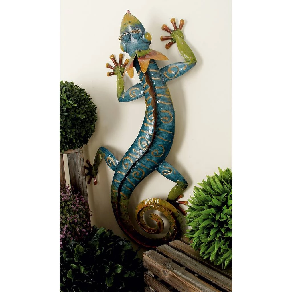 Elevate your indoor or outdoor space with the help of this gecko-inspired wall sculpture. This accent piece is bound to impress your guests with its marvelous design and uniquenessβa stunning wall art featuring a colorful three-dimensional gecko with textured green, blue, and brown finishes.