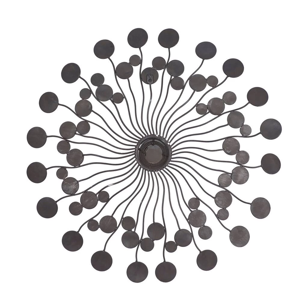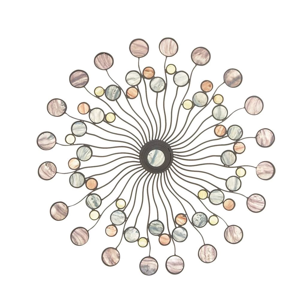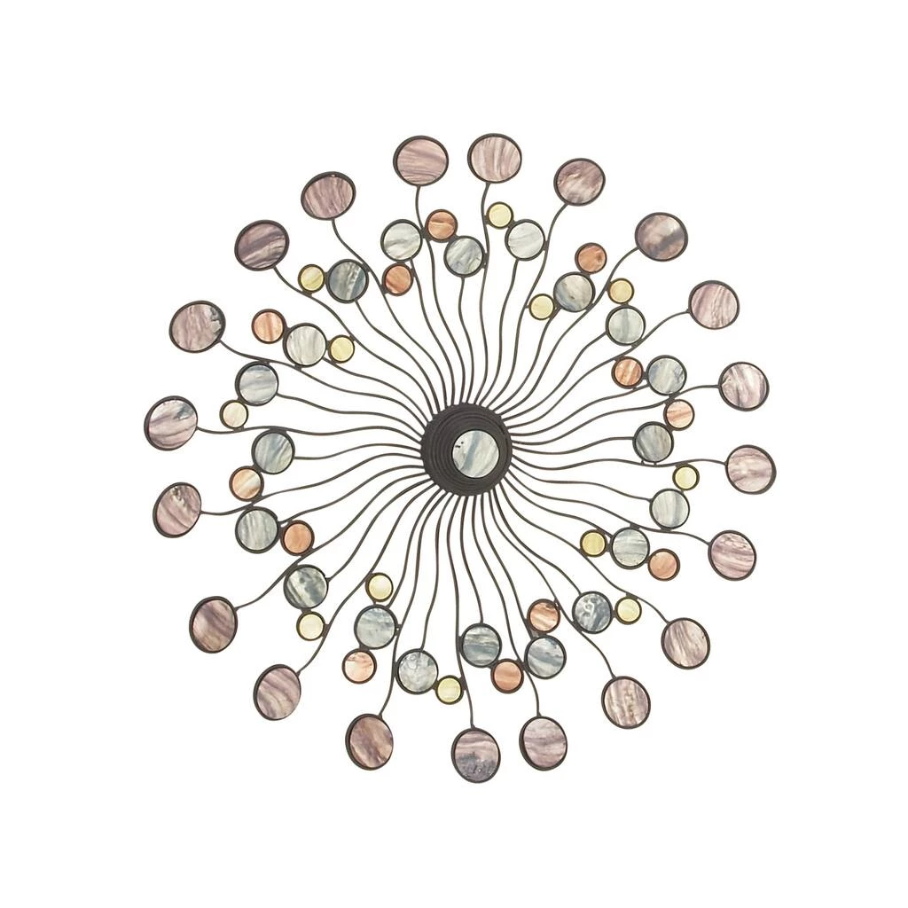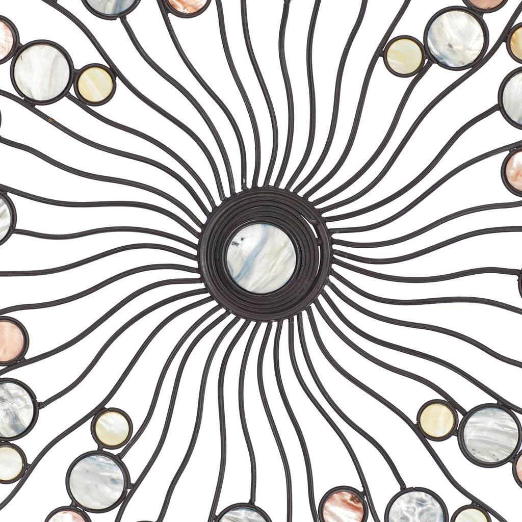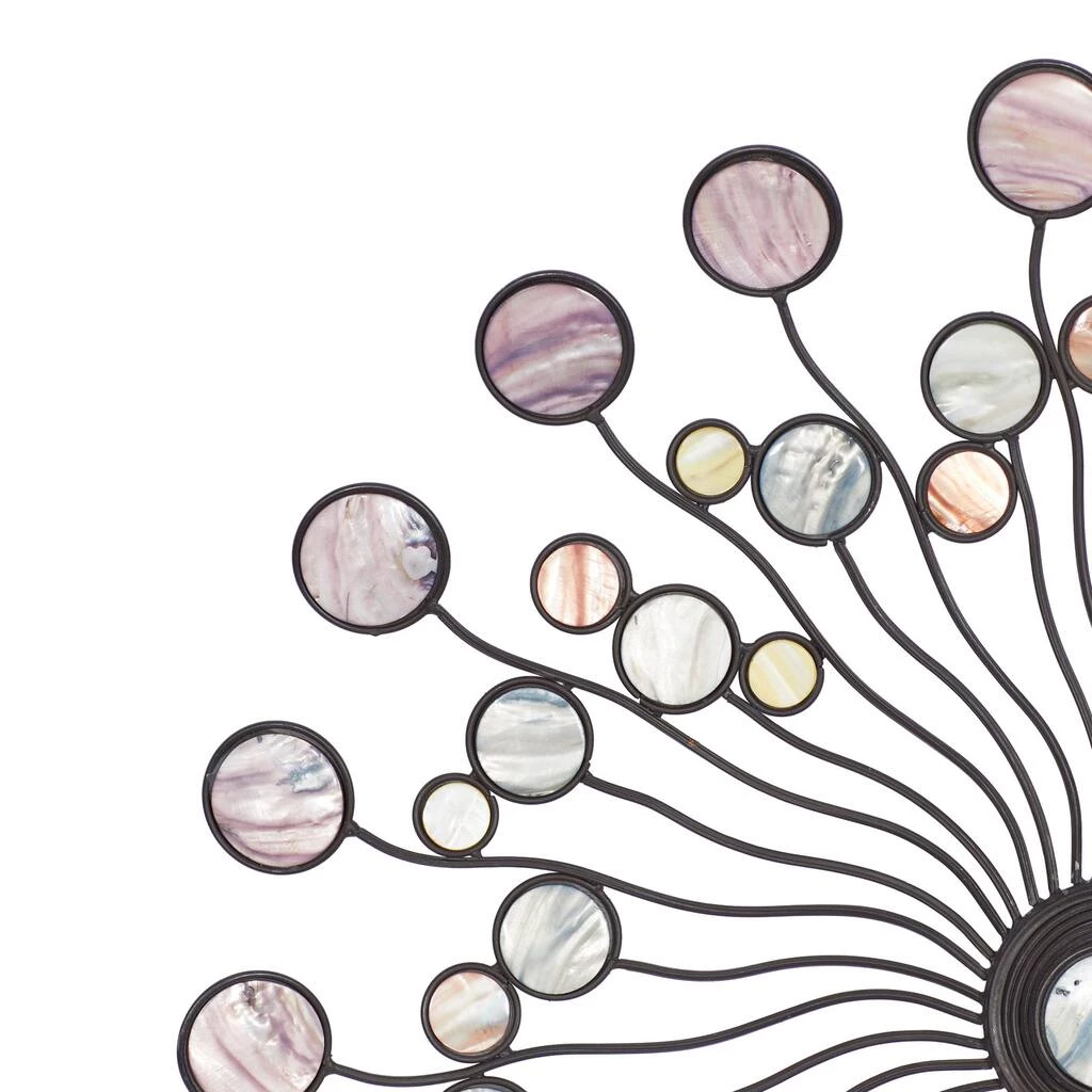 Add vivid movement to your walls with this large metal wall decor piece, featuring wavy black iron arms radiating from the center and finished with small and large, opalescent colorful shells. Rich in modern wall decor style with an animated silhouette and cloud-like textures within the circular shells in versatile tones, including purple, terracotta, yellow, and gray-blue.
