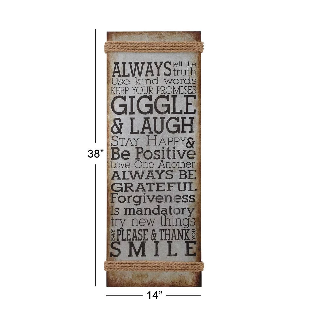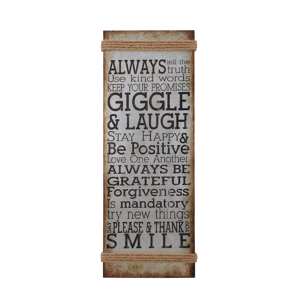Keep your home or office spirits up with this motivational wall art, featuring an antique-finished metal rectangle with inspirational quotes. The silver metal sign has decorative rust around the edges for a vintage look, and three rows of natural rope wrap around the top and bottom for extra texture and tactile dimension.