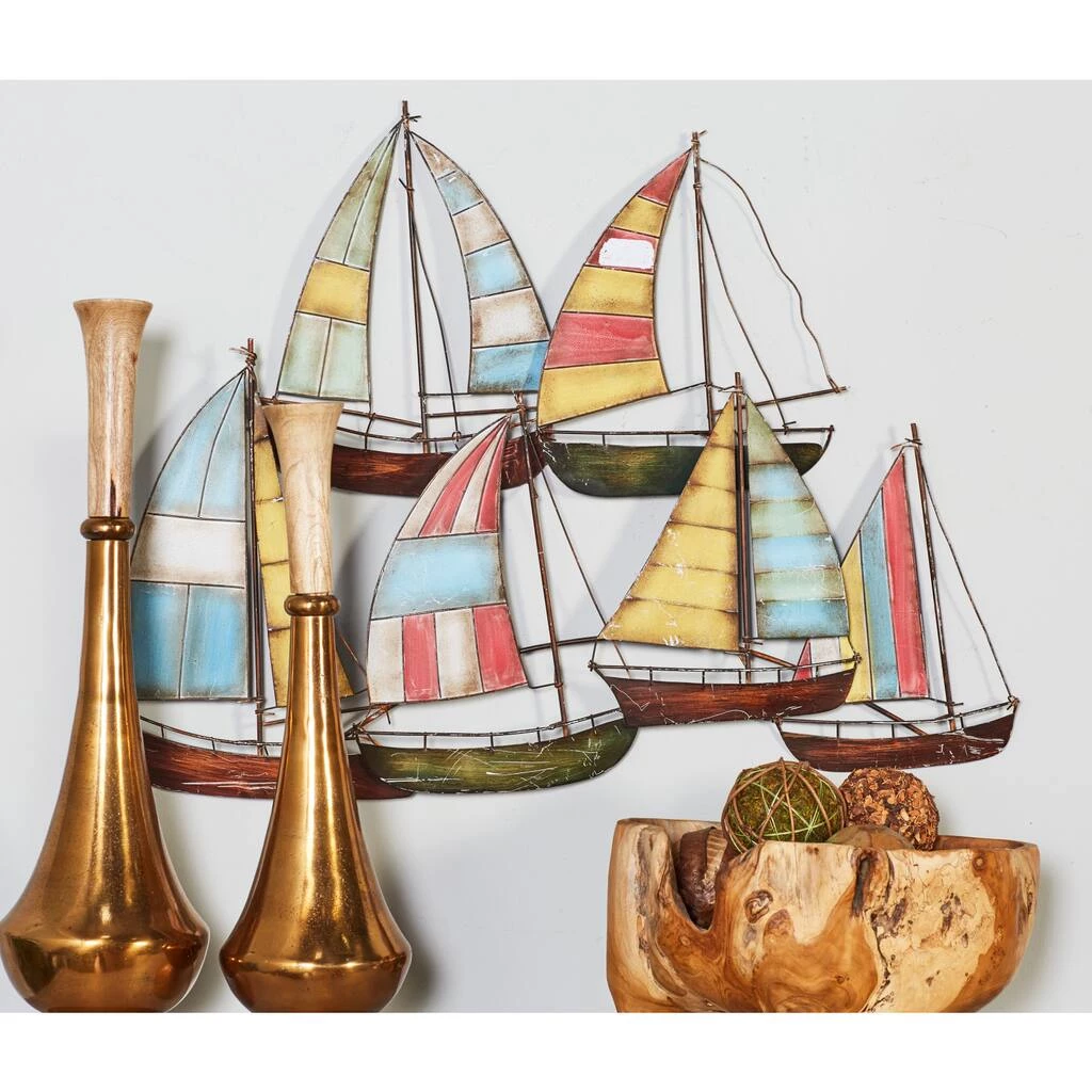 Add cheery, coastal style to your home with this large metal sailboat wall accent. It features dimensional, colorful, and textural striped sails with yellow, green, blue, white, and red finishes.Β