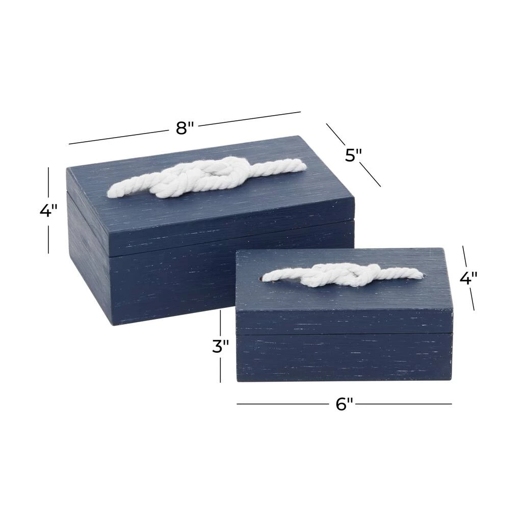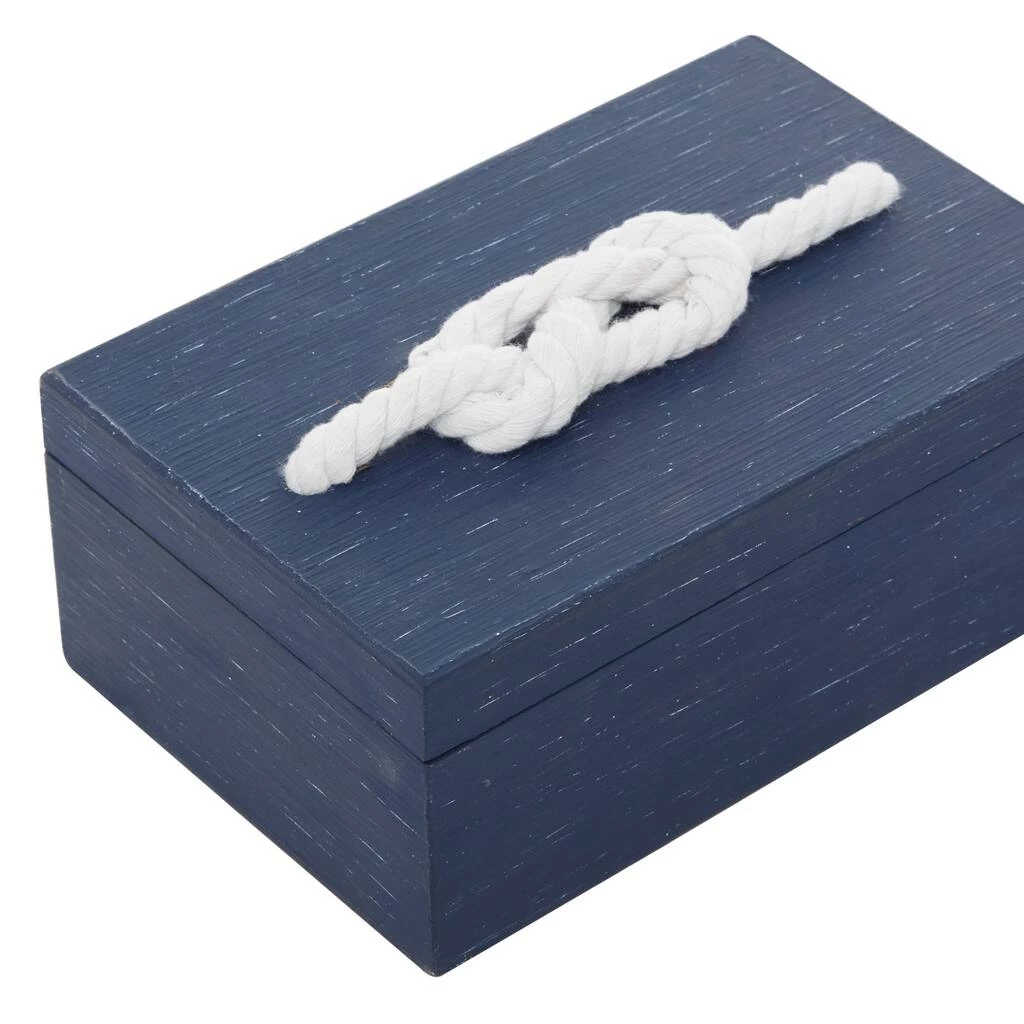 Add some personality to your living space with this 2-piece coastal style blue wood and white jute decorative box. These rectangular boxes are designed to handle small objects inside them that range from jewelry, change, pet supplies, or keys. The deep ocean blue finish on the wood material pairs these boxes well with your coastal themed home and is topped with a white jute rope knot detail on the lid. Display these wood boxes on desks, accent tables, or any flat surface, to boost the beauty of your home.
