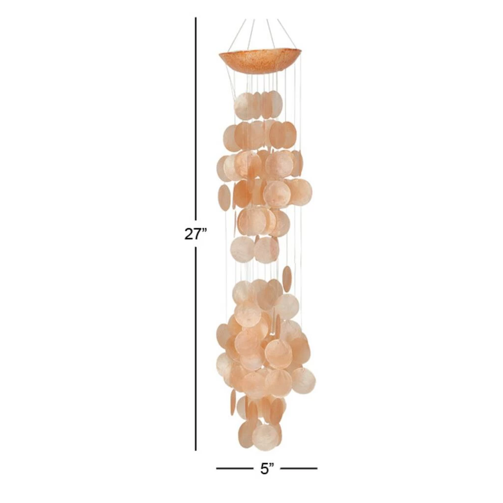 Calm your mind and breathe into the ocean breeze as you take a break from your daily life and marvel at the beauty of Mother Nature and her gracious bountifulness. Let the sound of wind be magnified as they drift into your home’s entryway and tall wooden windows with this coastal-inspired, coconut and Capiz shell windchime! This opulent home decor showcases a half-shaped coconut shell windchime base and smaller round Capiz shells attached to its clear white strings in a smooth ‘sun-kissed’ orange finish. This item comes shipped in one carton. Item features metal loop for easy and secure hang. Suitable for indoor use. Made in Indonesia. Coastal design.