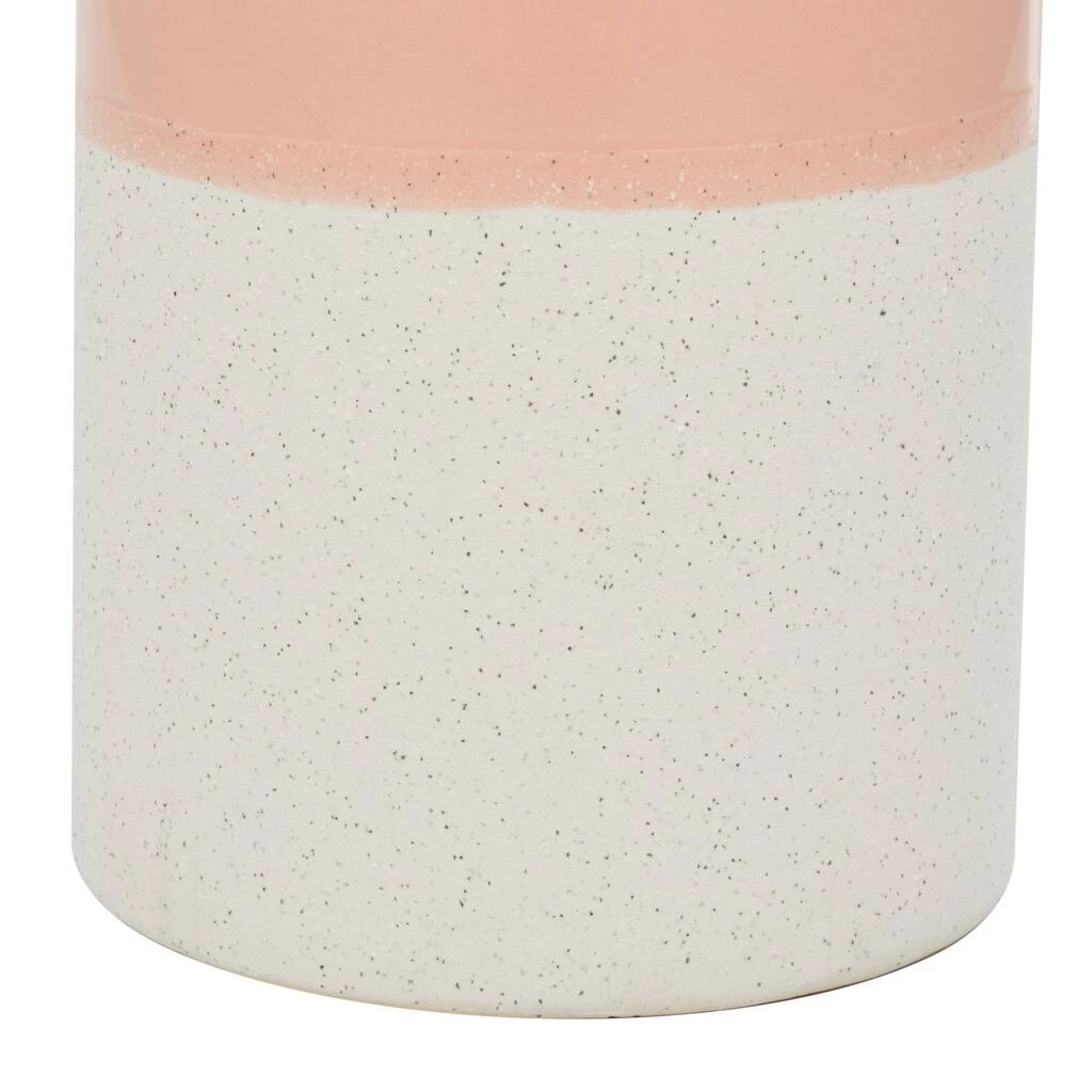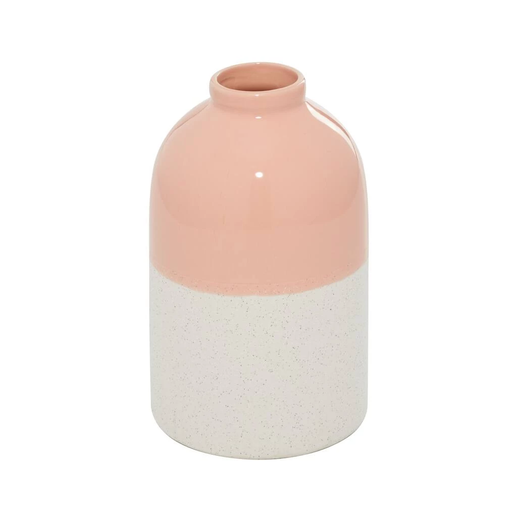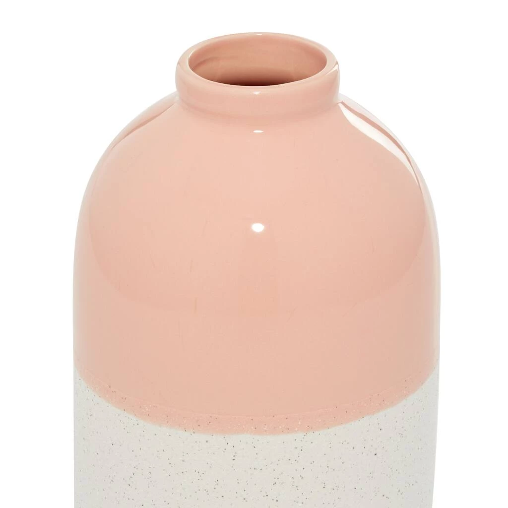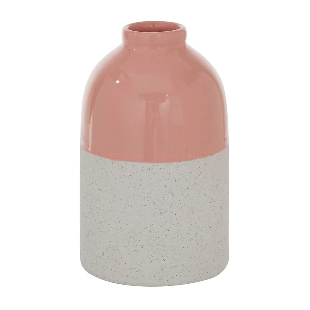 Sweet and modern, this ceramic bottle vase features chic color-blocking, boasting a glossy pink glaze on the top half and a matte gritty white finish beneath. The wide cylinder bottle vase shape features a small opening at the top. The soft finishes should work with most color palettes, and can stand alone or be filled with a stem or two of vase filler for a lovely juxtaposition. This item ships in one carton. Suitable for indoor use only. Cylinder vase with fluted and medium-sized rim opening. Modern Design.