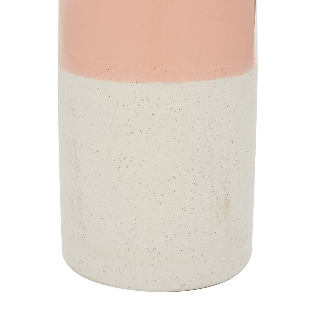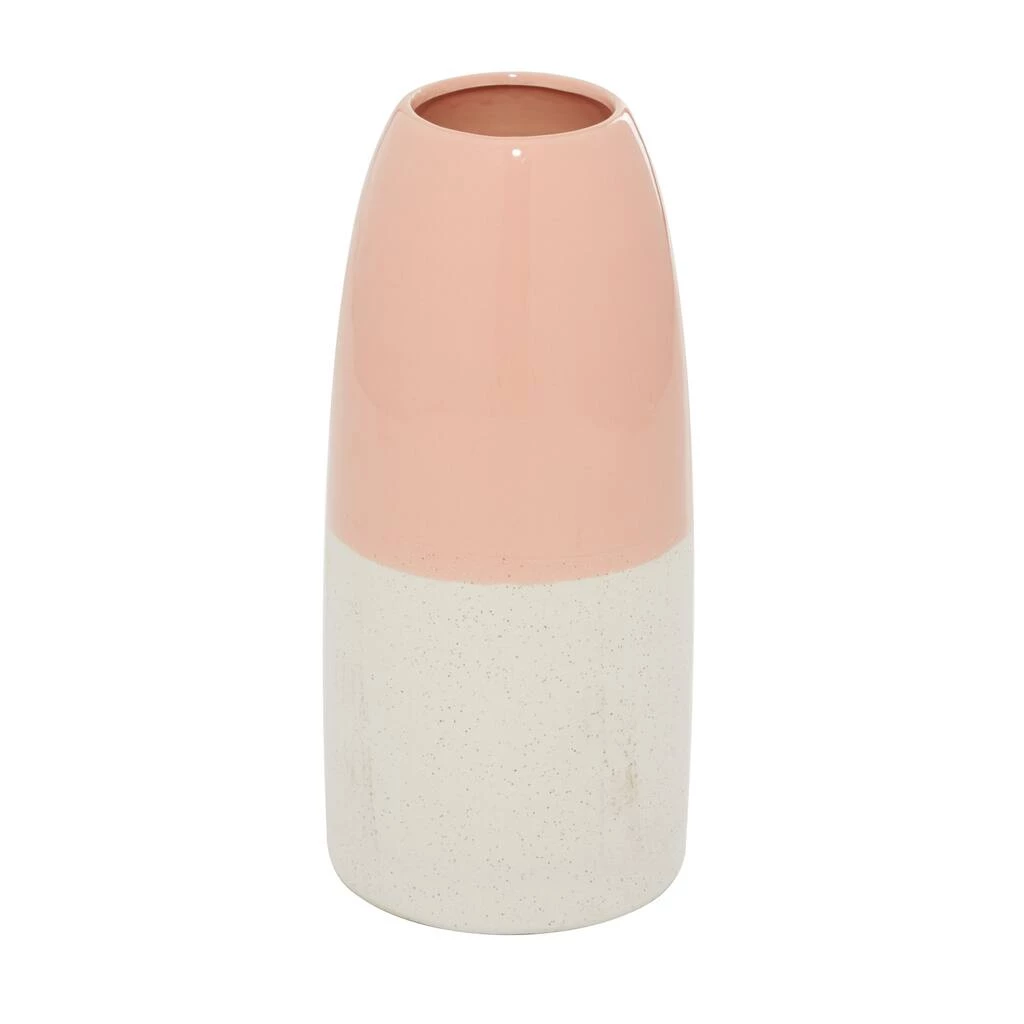 Sweet and modern, this ceramic vase features chic color-blocking, boasting a glossy pink glaze on the top half and a matte gritty white finish beneath. The tall cylinder shape features a top opening with no lip for a clean, modern look. The soft finishes should work with most color palettes, and can stand alone or be filled with a small bundle of vase filler for a lovely juxtaposition. This item ships in one carton. Suitable for indoor use only. Tapered cylinder with medium-sized rim opening. Modern Design.