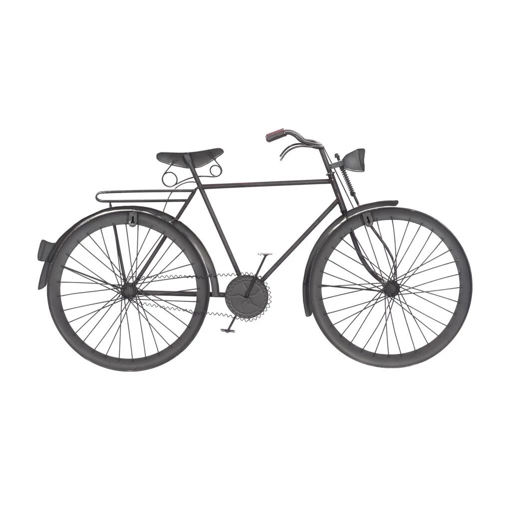 This retro-style wall-mounted bicycle wall dΓ©cor piece is almost life-sized, bringing a bold, antiquated essence to any room. It carries all the key features, a bell, a headlight, a black seat, a front and rear metal fender, spokes, wheels, chain, and a pedal. The bicycle frame has a metallic red finish that adds a bold pop of color to an empty wall.Β