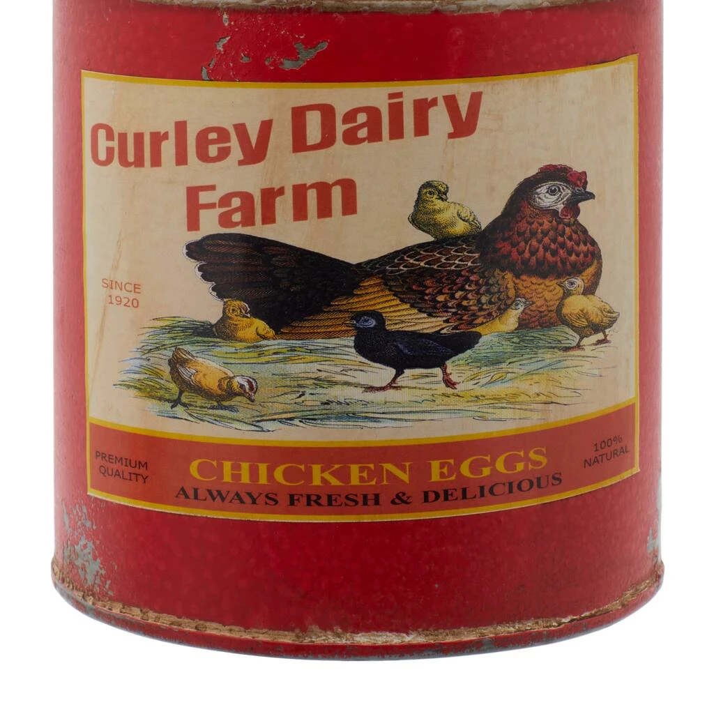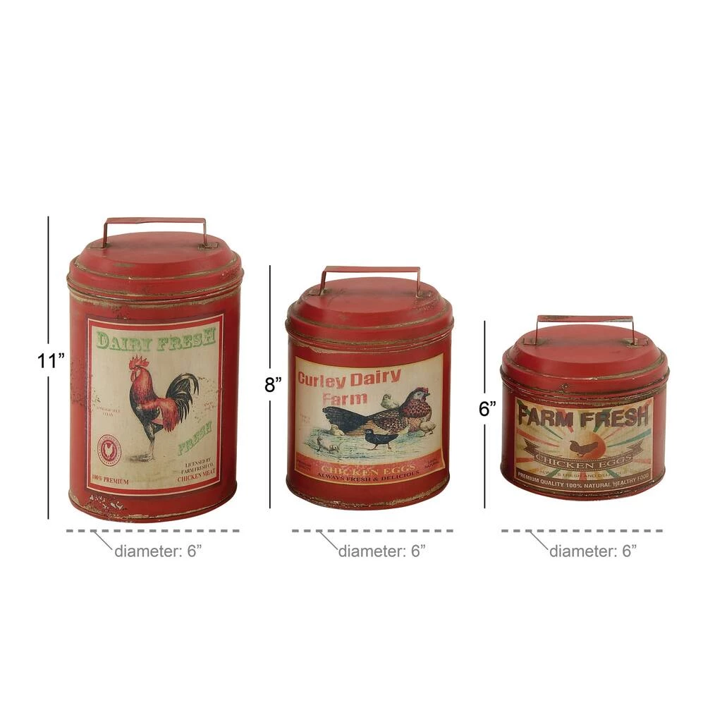 Embody the farmhouse theme of your home interior designs with this set of 3, fire engine red canisters. These storage units come in different sizes and offer a variety of classic chicken-themed advertisements in old sticker prints. These tin canisters will make good stand alone decorations on kitchen counters or storage for small objects.