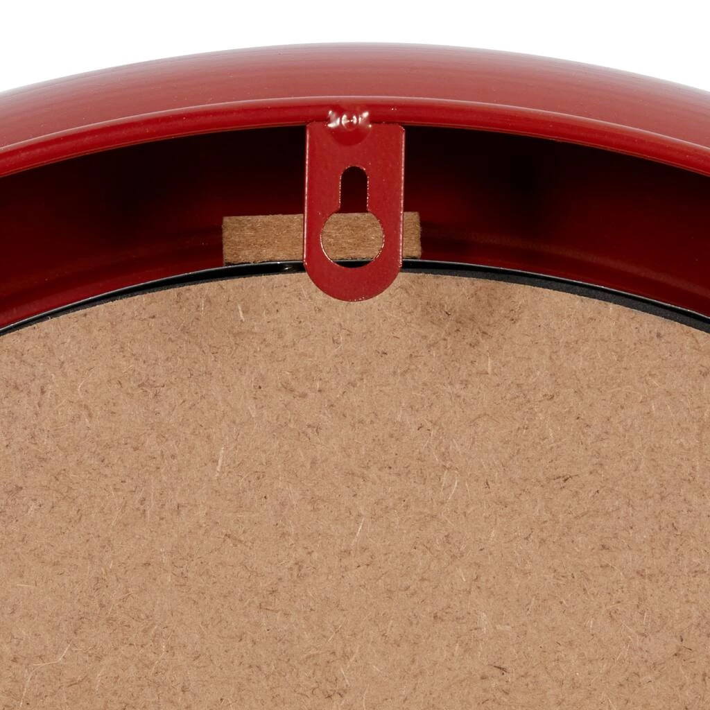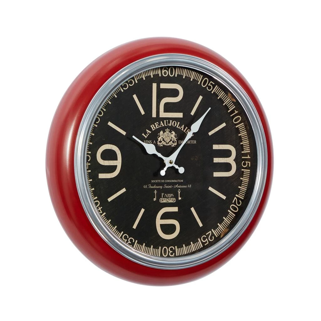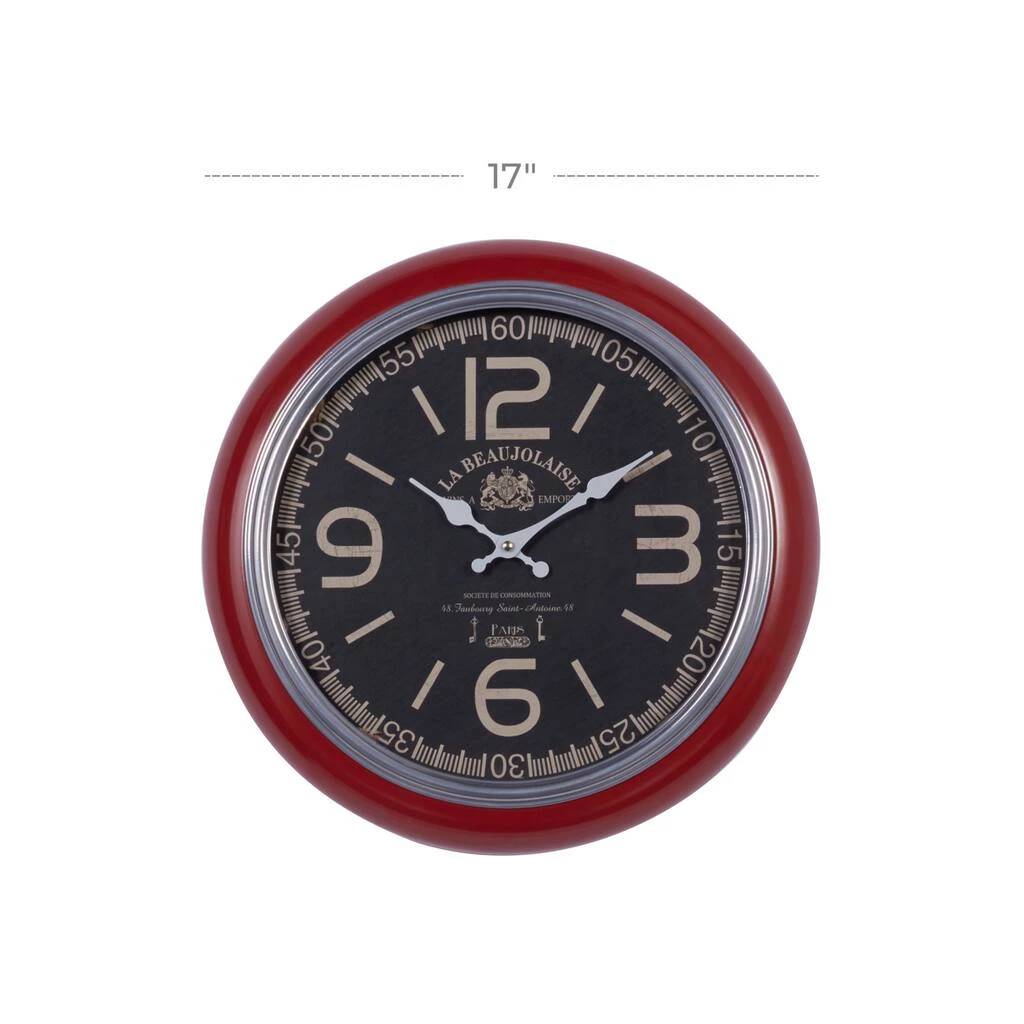 Crete a bold look with vintage charm in your space with this round metal wall clock, featuring French illustrative script accents. The round metal frame has a red finish with metallic silver trim, housing the black interior clock face with extra large, easy-to-read numbers. Requires 2 AA batteries. Not Included. This item ships in one carton. Features Arabic numerals for 12, 3, 6, 9 markers. The clock mechanism runs silent. Item is ready to hang by keyhole slot in the back. Suitable for indoor use only. Clock face reads “LA BEAUJOLAISE Vins a Emporter, Paris” with the classic lion emblem and key illustrations. Vintage inspired.
