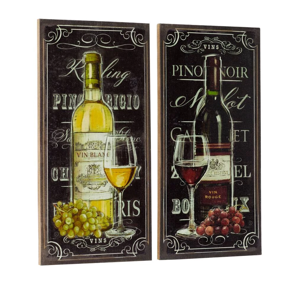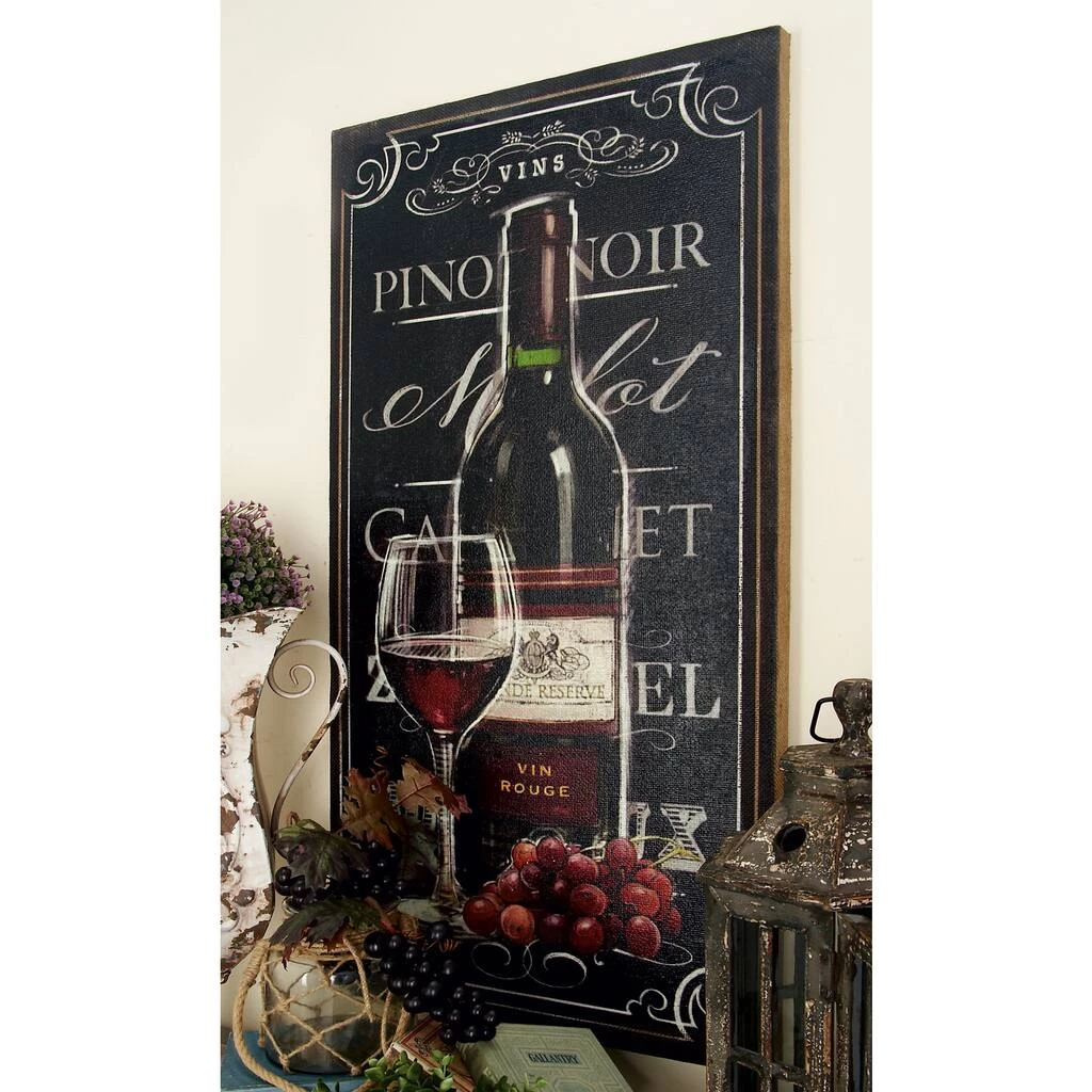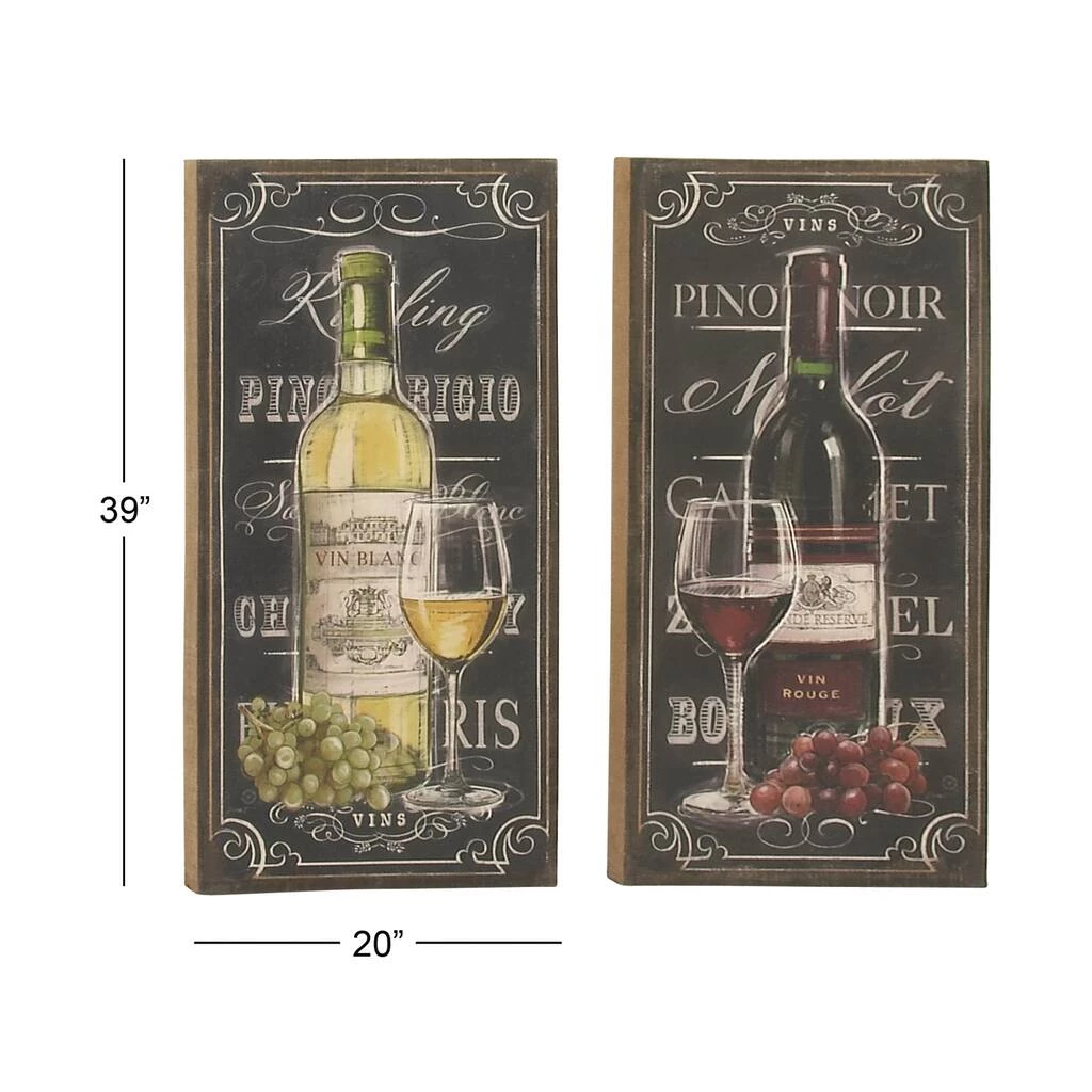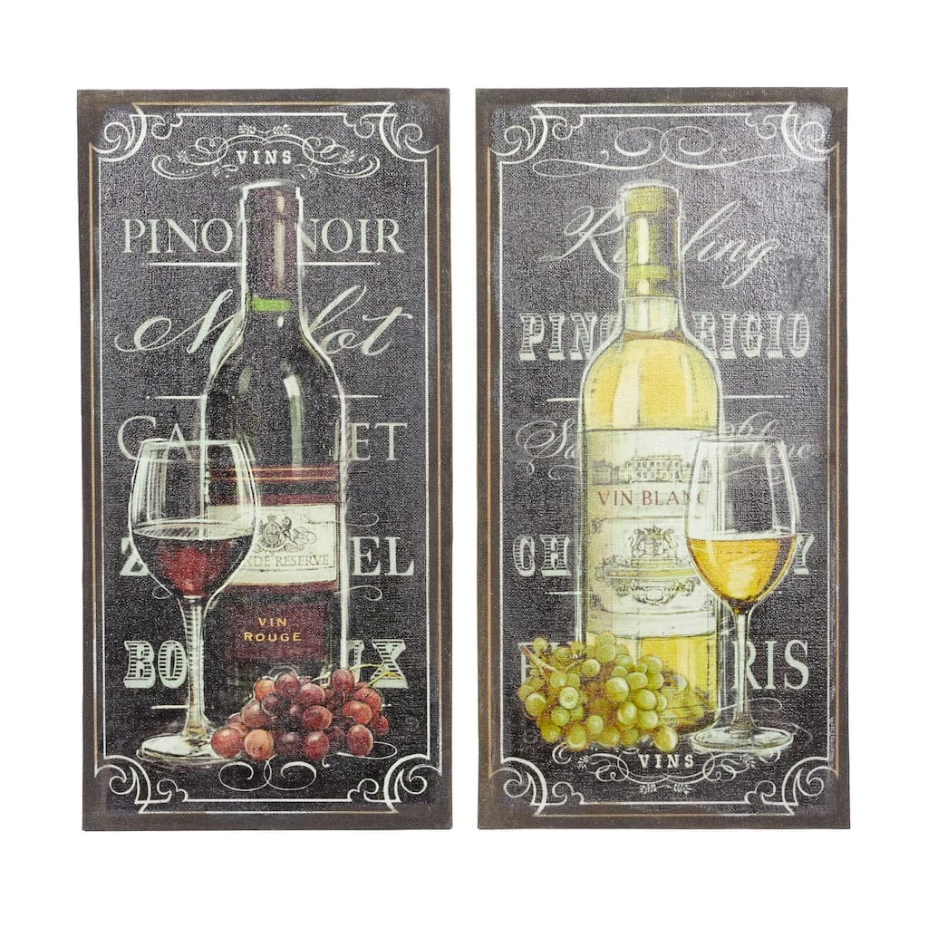 Add a touch of pleasure in to your home with these assorted 2-piece extra large wooden wine bottle on burlap wall decor. The unique texture of burlap fabric printed with wine bottles and glasses, grapes and black restaurant chalk menu boards extends the experience of fine dining to your kitchen, bar, or wine cellar. Hang these pieces together with your wine holders, trays and bottles to top it all off. These wall art feature built in slotted hangers. Suitable for indoor use only. This wall decor comes in set of 2. Showcases “VIN ROUGE “, “VIN BLANC”, and other background typographies. Traditional theme. This item comes shipped in one carton.