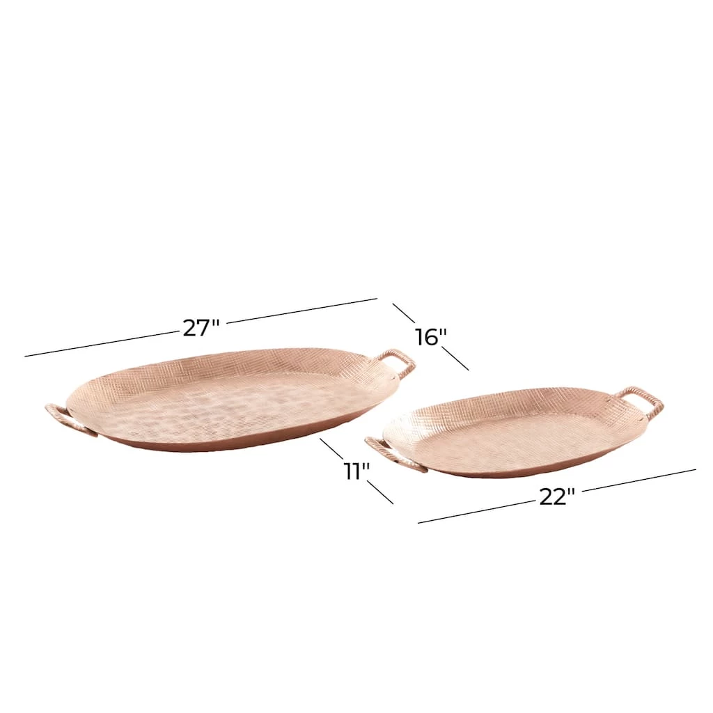 Functional and aesthetically pleasing, this oval aluminum decorative tray set is a fabulous accent piece that gives flair to your console table or side table. A storage piece that is spacious for your trinkets or decorative goods on your mantle, coffee table or kitchen counter. Keep your table top protected as you display your memorabilia and belonging on these trays. This item comes shipped in one carton. Please note that this item is for decorative purpose use only and are not food safe. Suitable for indoor use only. Made in India. This set comes with 2 trays. Rustic Setting.