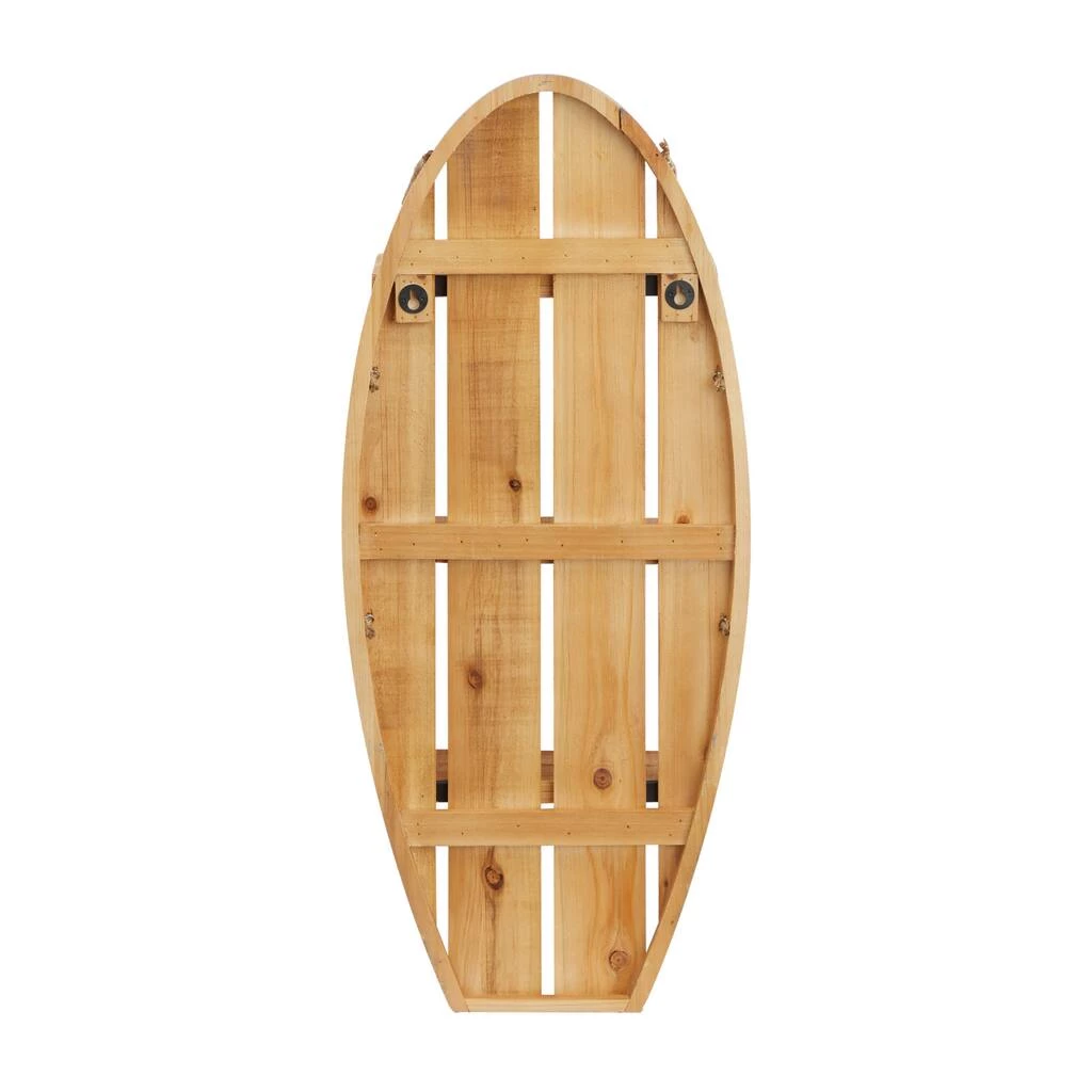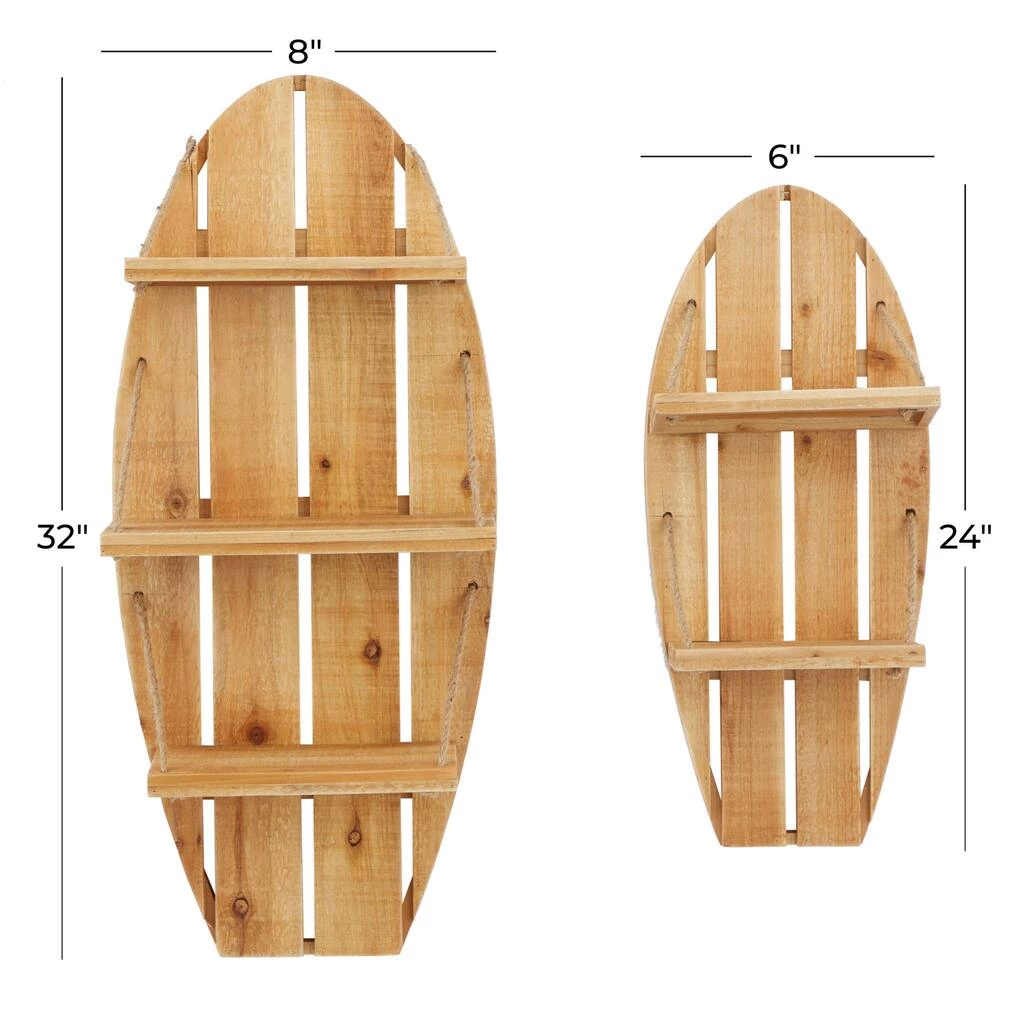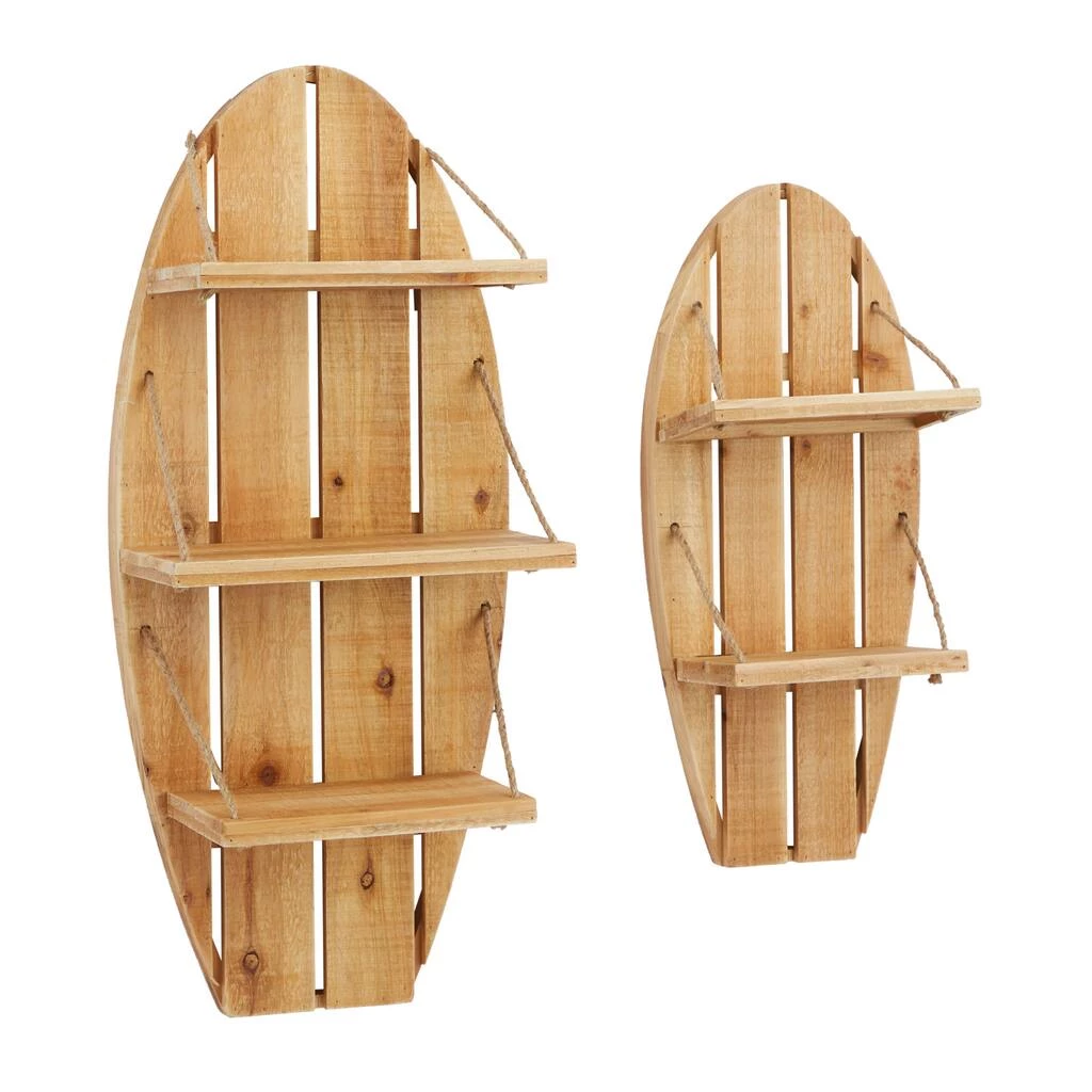 Accessorize your living space and bring a feel-good vibe with this functional wooden wall shelves that provide additional storage any where in your home. Whether used as a focal point, or to display your favorite things, this wall shelf it the perfect addition to any home. Utilize your wall space to add more storage for a space saving solution in any compact area. This item comes shipped in one carton. The wood slats are attached and mounted together to form boat-shaped shelves. Items come with keyhole slots at the back for easy and secure hang. Suitable for indoor use only. This set comes with 2 wall shelves. Coastal Style. Item has max weight of 15 lbs.
