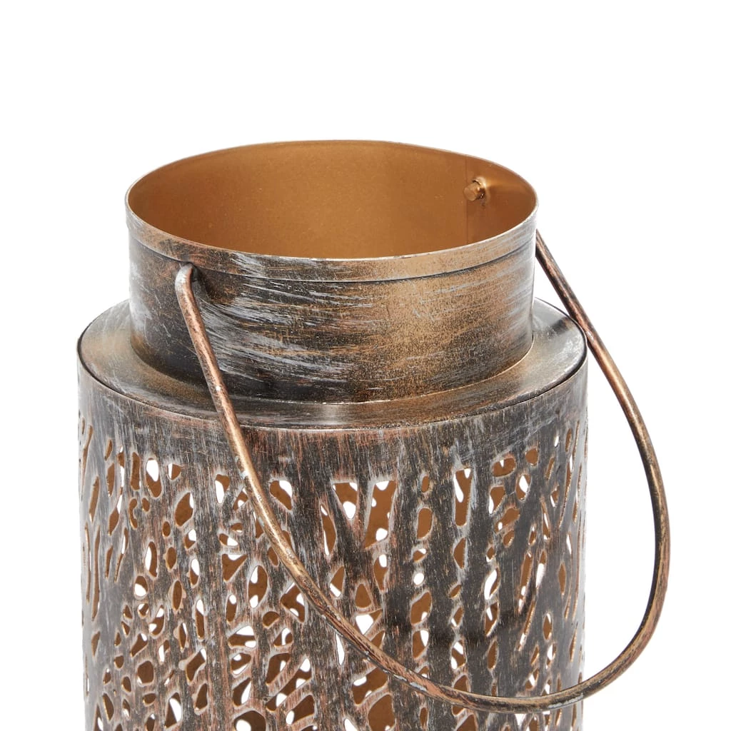 These eclectic style inspired design lantern candle holders will add warmth and light when displayed together on shelves, tables, or display separately in different rooms for light ambiance glow. Create a dreamy, ambient space with this pair of antique brushed metal lanterns, featuring pierced metal designs. Each cylinder lantern is crafted from iron with pierced patterns–one with a quatrefoil pattern, one with a forest of trees–creating negative space for your lit pillar candles to glow through. The base colors are a dark gold but the heavily brushed brown paint over top creates an antique look. Metal ball feet keep the lanterns from getting too hot on your surfaces, and thin metal handles allow for easy transport and hanging where safe. Designed with ball stoppers at the base that prevent scratching furniture and table tops, as well as sliding around. This item ships in 1 carton. Metal handle for easy displaying. Suitable for indoor use only. Made in India. This set includes 2 lantern. Eclectic theme. Lantern pillar candle holder that can hold 1 pillar candle each.
