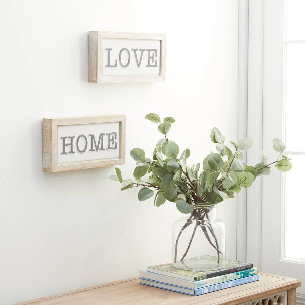 Add a warm greeting to your home with this pair of charming wood-framed metal wall signs, reading “LOVE” and “HOME.” Each rectangular wall sign features a lightly whitewashed natural wood frame. The metal sign script is all-caps rounded serif typewriter font in a dark grayish brown hue over an eggshell white background. Items feature sawtooth hardware for easy hang. This item comes shipped in one carton.