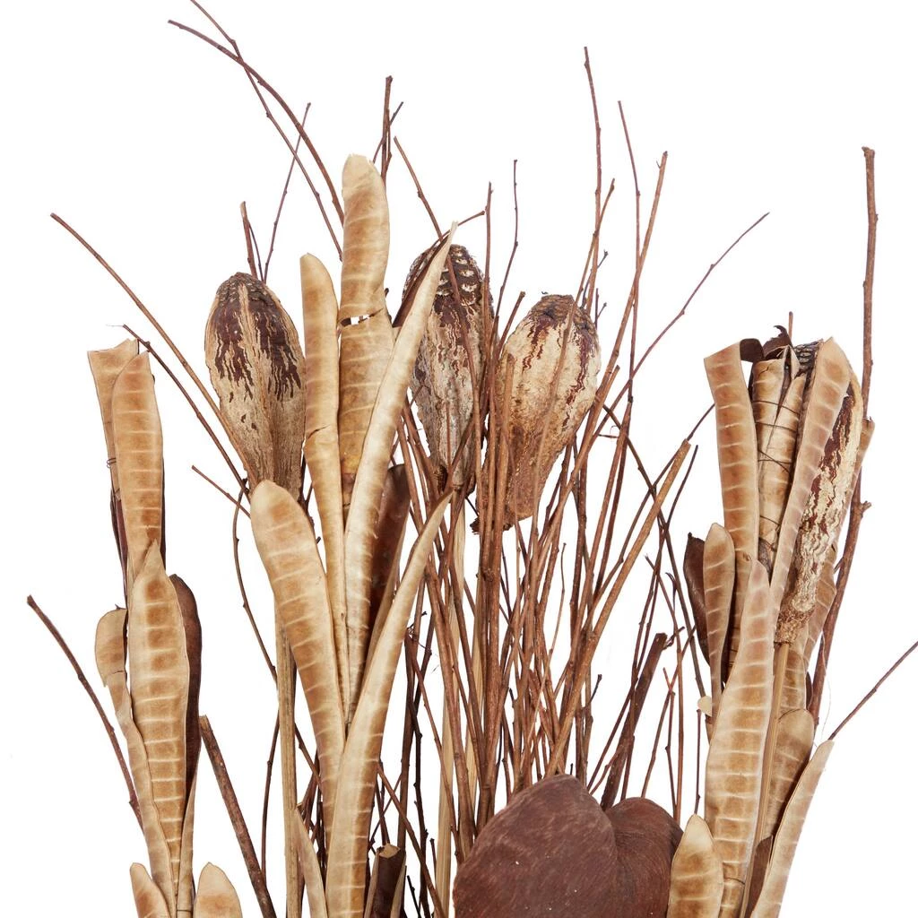 Bring a natural and earthy look to your table tops and shelves with this set of 2 reddish brown, mocha brown, and beige, and cream-colored decorative dried flowers and grass bunches. Each vase filler bundle features dried, hard, long strands of straight, spiral, and wavy grass strands with small flower buds and woven orbs. This home decor set makes great accent decor for spaces needing some natural and neutral tones while offering a perfect solution for non-waterproof vases. This item comes shipped in one carton. This natural foliage set comes with preserved dried plant materials. Suitable for indoor use only. Made in India. Each set comes with 2 natural foliage decors. Coastal theme.