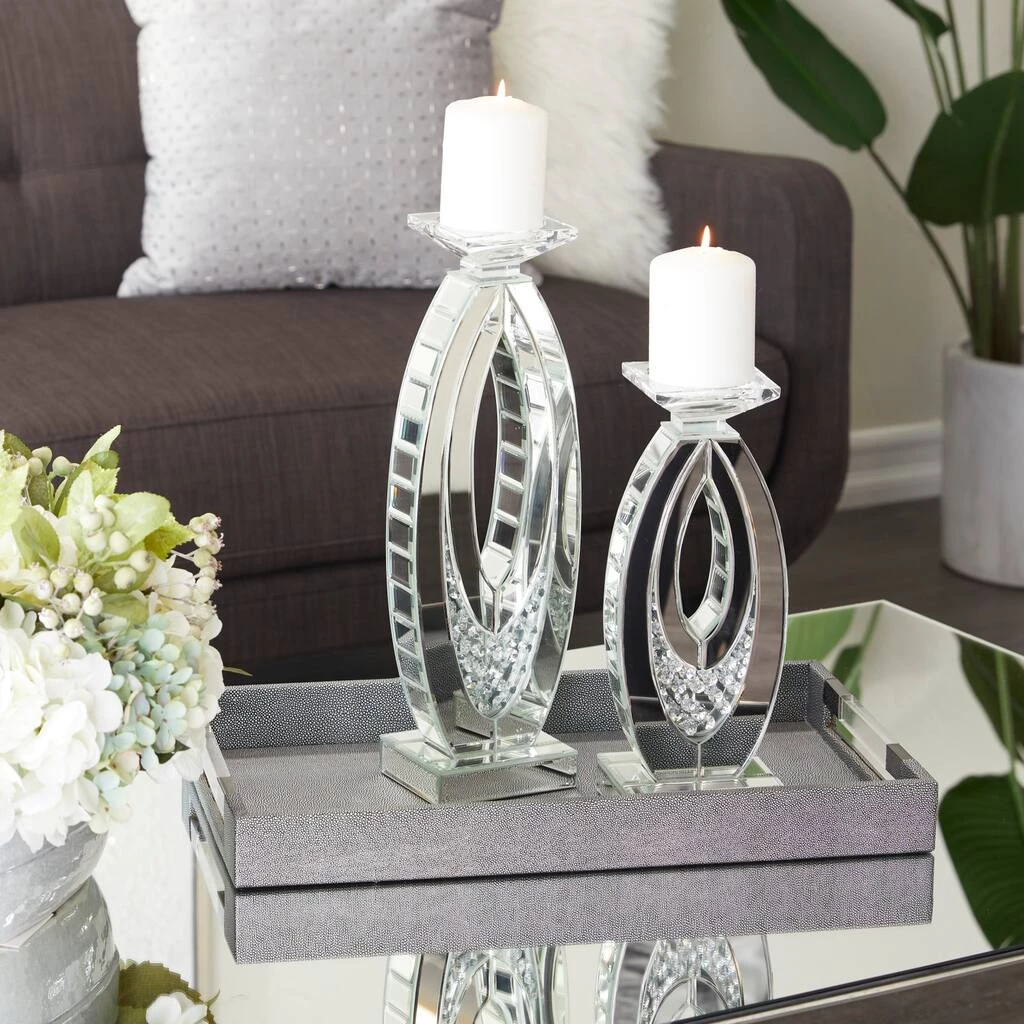 Illuminate your living room or bedroom with these candle holder and add an eccentric and elegant touch to your home corners. Delight your guests and make any occasion extra special by adding a lighted or flameless candle to this candle holder centerpiece. A sturdy and long lasting construction that for a long lasting display. Designed with black rubber stoppers at theΒ baseΒ that prevent scratching as well as sliding around. Each pillar candle holder includes 1 candle. These items come shipped in one carton. Glass overlay furnish the engineered wood frame structure. Suitable for indoor use only. Set of 2 candle holders. Glam inspired.