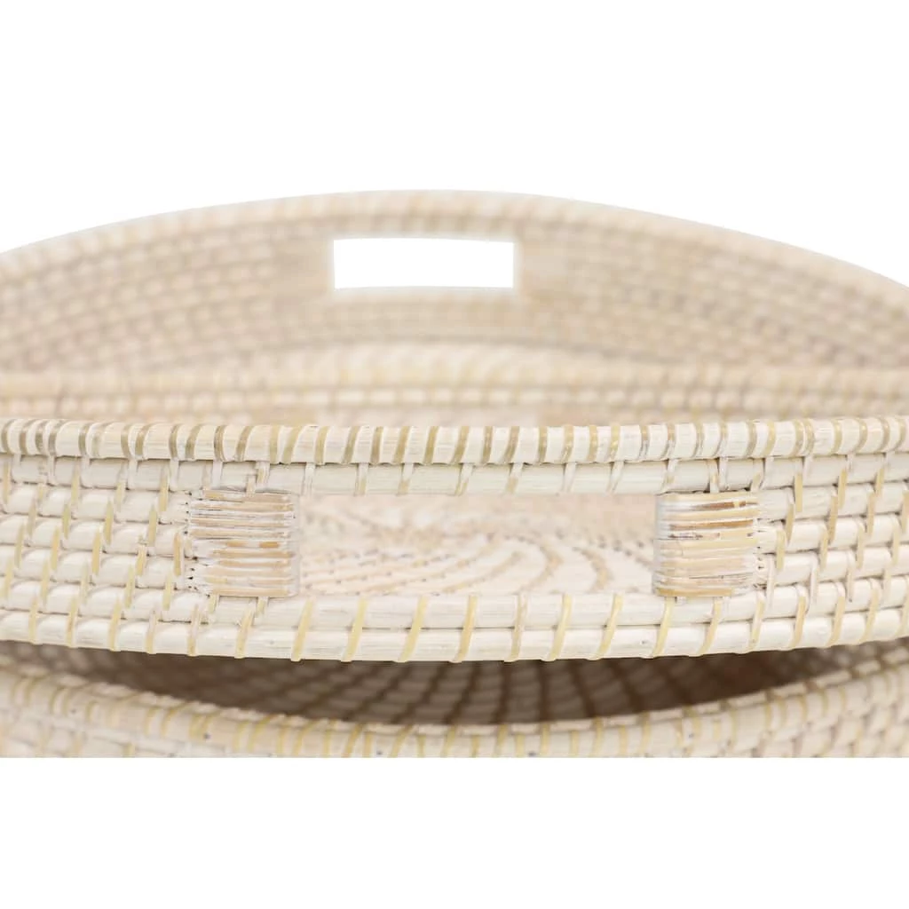 Display these trays solo to add a pop of neutrally-toned texture on your shelves or tabletop. Whether in your kitchen, or on your coffee table, it’s a great way to display and store your favorite things. A storage piece that is spacious for your trinkets or decorative goods on your mantle, coffee table or kitchen counter. This item comes shipped in one carton. Please note that this item is for decorative purpose use only and are not food safe. Suitable for indoor use only. Made in Indonesia. These rattan trays come in a set of 2. Bohemian theme.