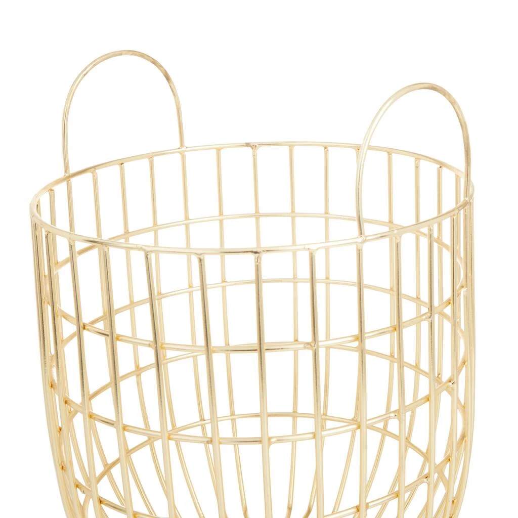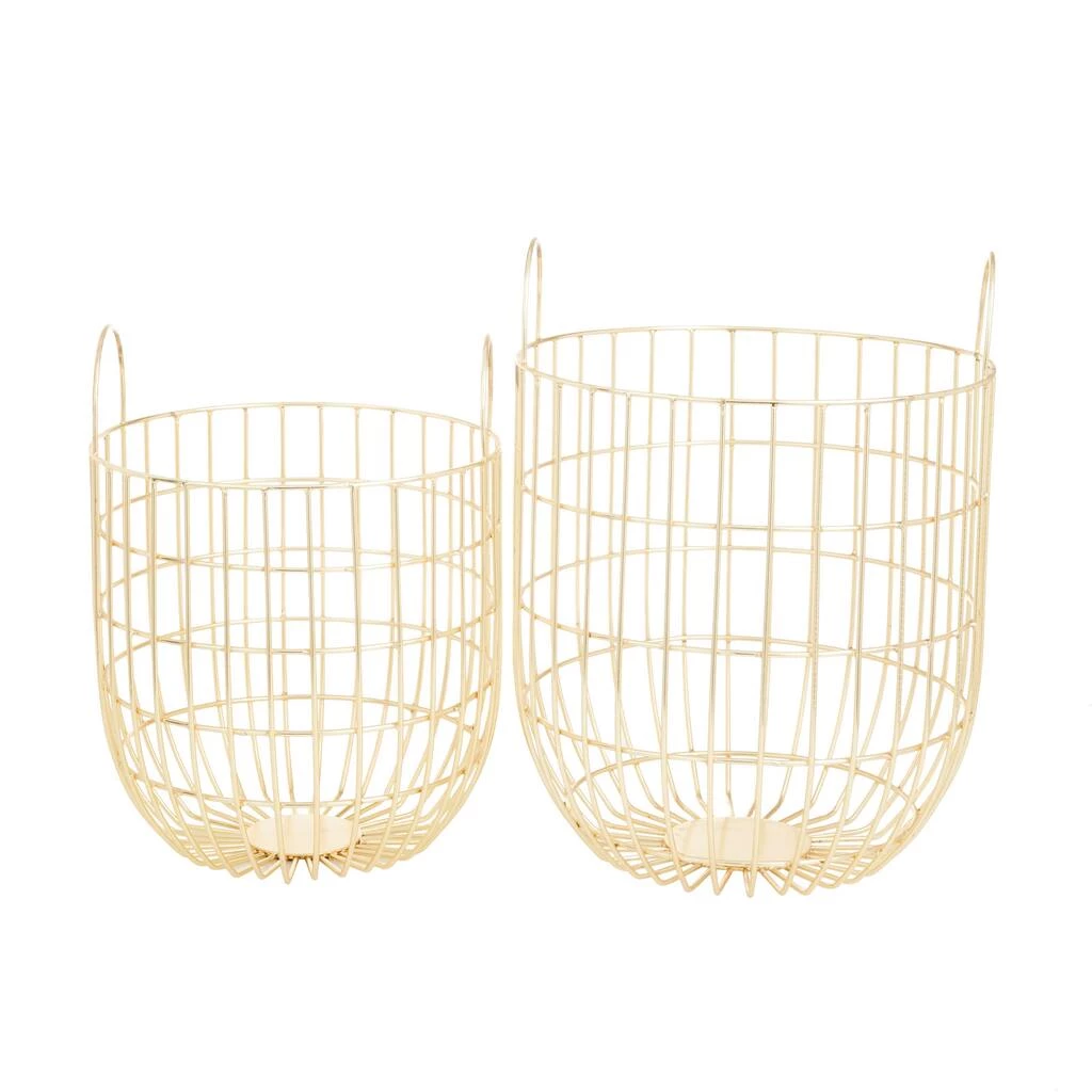 Organize and store your belongings with this golden metal baskets that adds a dash of shimmer to your bedroom or living room spaces Keep your space tidy and neat with the help of these storage baskets. Place them by your bedside, laundry room or living room to keep your space free of clutter. These items come shipped in one carton. Set of 2 metal baskets. Contemporary design. Suitable for indoor use only.