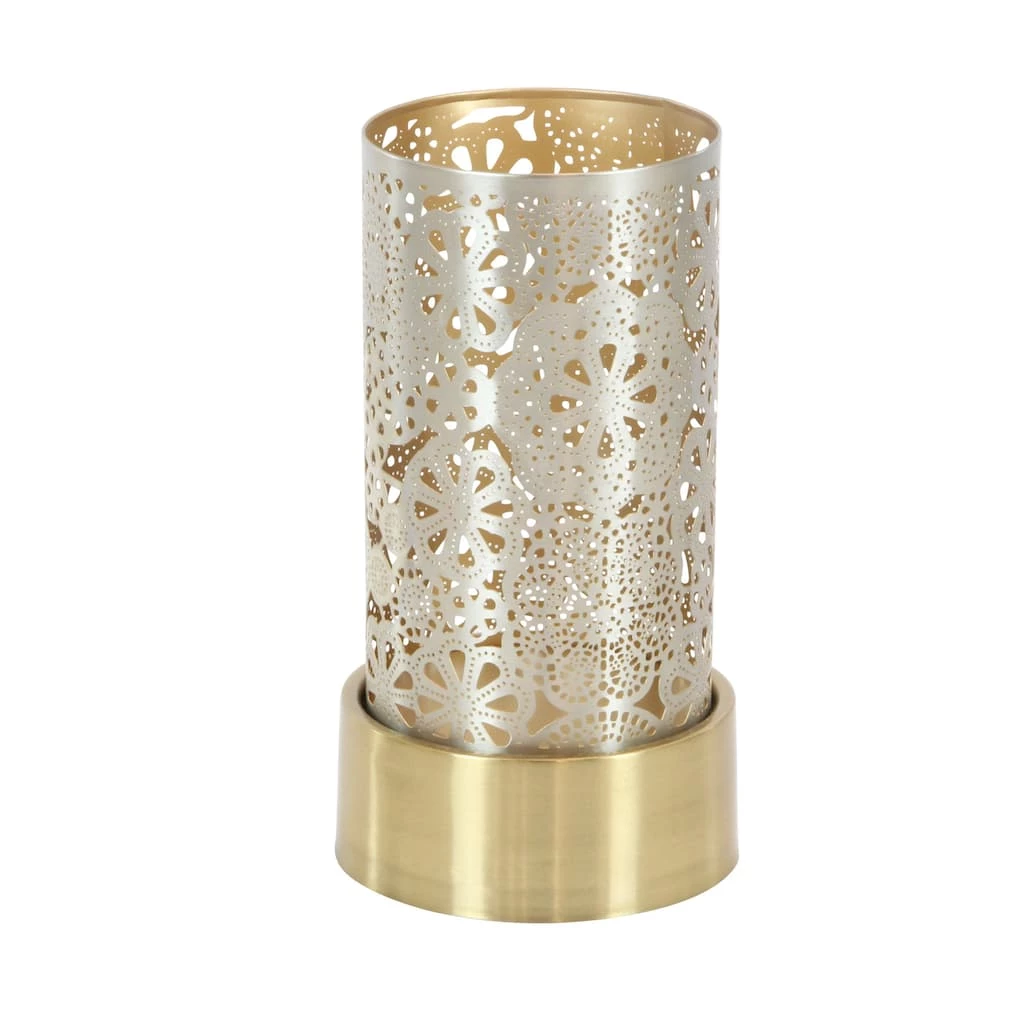 Create a gorgeous display of candlelight and metallic shine with this set of metal lanterns. The set includes two lanterns, and one is slightly short than the other. Made of iron, both lanterns feature a cylindrical sleeve with floral cut-out designs. The silver-finished sleeve sits on a gold-finished base for an eye-catching aesthetic. This pair of lanterns is made in India and complements eclectic- and glam-style spaces. Designed with black rubber stoppers at the base that prevent scratching furniture and table tops, as well as sliding around. This item ships in 1 carton. Suitable for indoor use only. Made in India. This set includes 2 lantern. Eclectic theme. Lantern pillar candle holder can hold 1 pillar candle each.