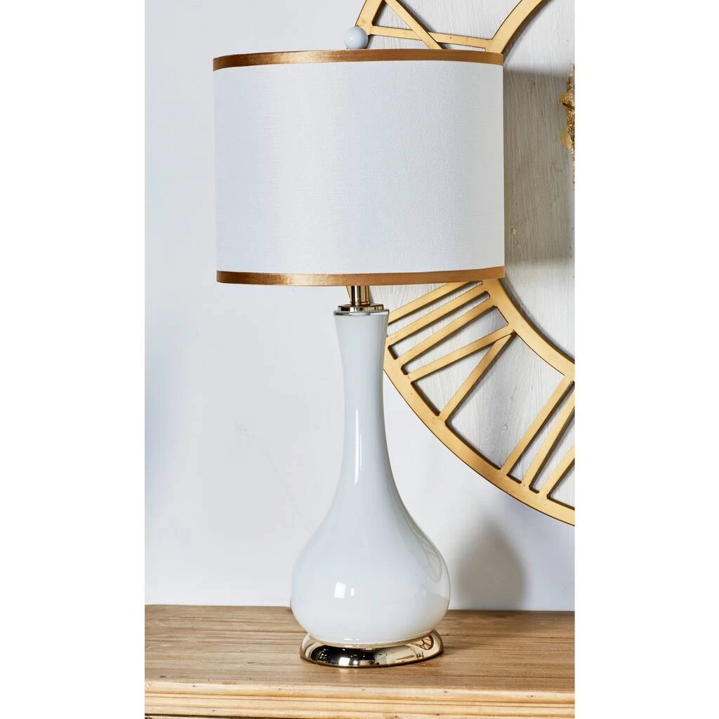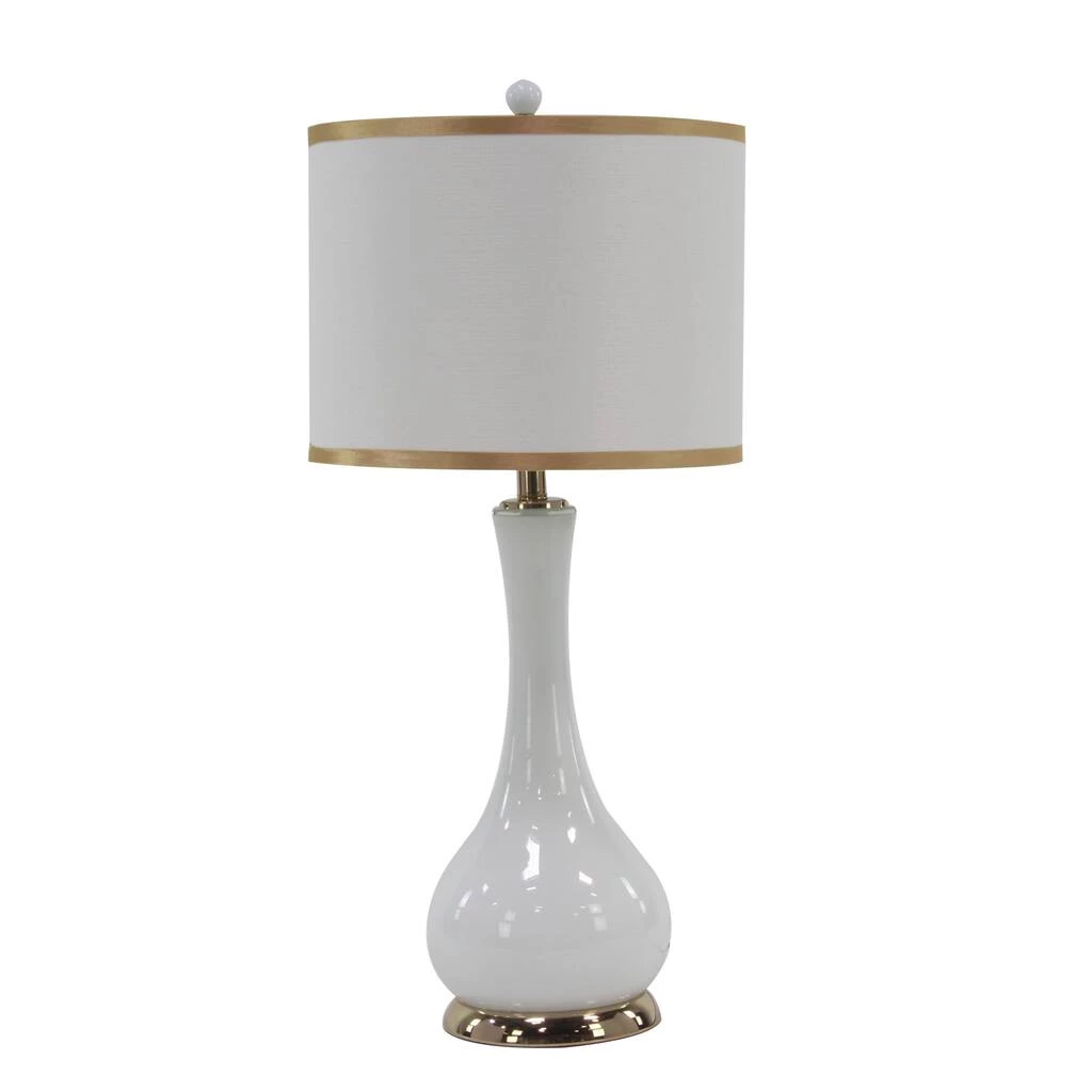 Brighten up any room to create a warming atmosphere for you and your guests with this chic table lamp. Make a statement with this unique lamp on mantle, console table or in any living space. Step up your room decoration with this striking table lamp that is perfect to display on top of any accent table in your light-colored interior. A socket for a medium-sized E26 bulb. Cord length is 75 inches. Suitable for indoor use only. Plain white drum-shaped linen shade with 13βL x 10βH measurements, and has a spider/harp fitter. Comes with an on/off switch. Traditional setting. This item ships in one carton.