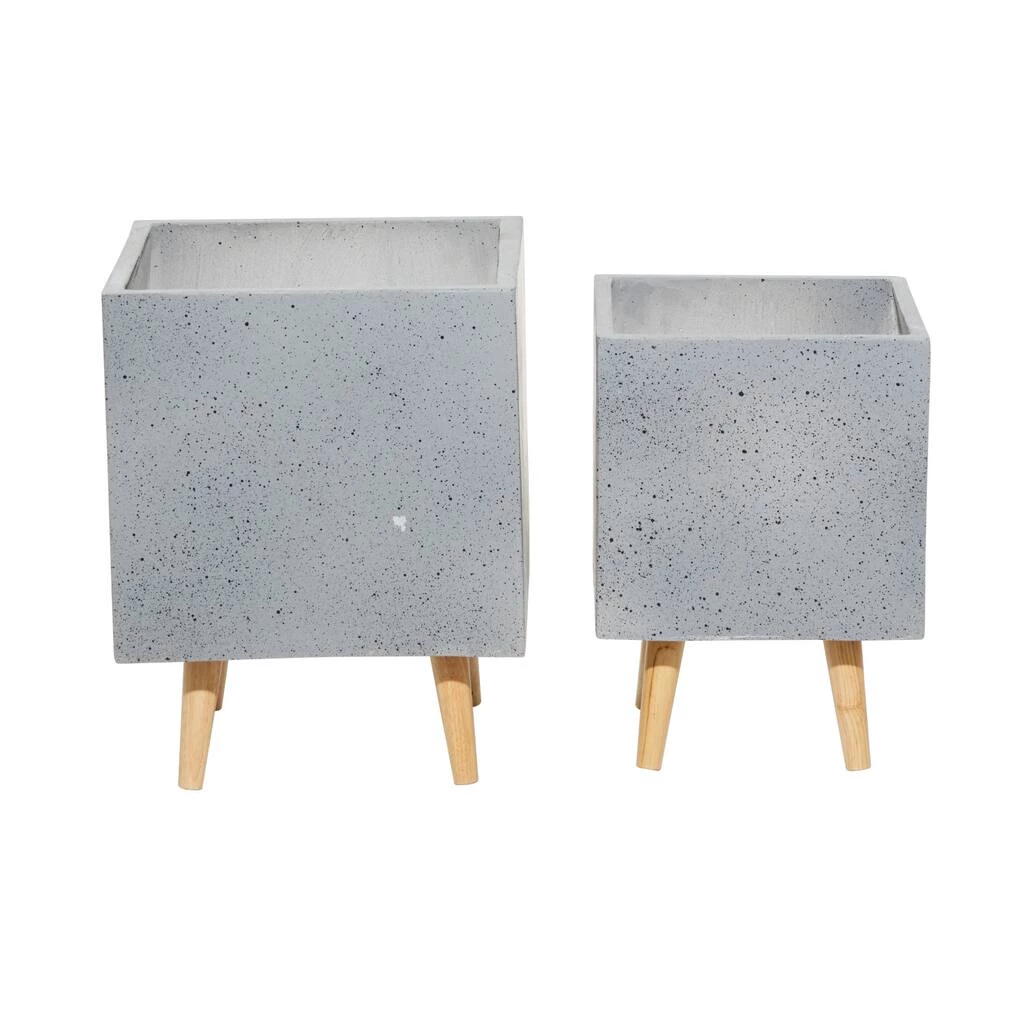 Add a fresh bit of stylish greenery in your chic inspired living space with this gray marble textured fiber clay planter 2-piece set and experience a revolutionary shift from simple interior Decor, to adding life into your home. This fiber clay-made planters features a unique cube-shaped design in a beautiful gray marble texture finish. The planter stands comfortably on a wooden tripod design in a charming light brown hue. This geometric planter set will bring a much-needed freshness with indoor plants in your chic style living space. Recommended for use with indoor plants that do not require much water or sunlight, since there is no drainage hole. This item ships in one carton.
