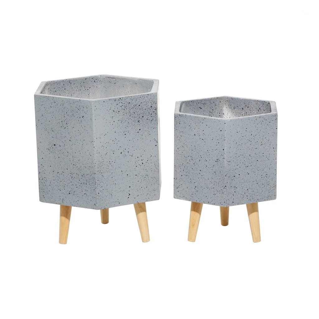 A smart chic style inspired living space knows how important mixing and matching is, especially when it comes to adding some greenery in your space. This gray marble textured fiber clay hexagonal planter 2-piece set is up for that task. The fiber clay construction of this planter means toughness without sacrificing beauty and elegance thanks to its hexagonal geometric structure. The entire piece rests on a wooden tripod leg design with circular wooden legs in a light brown hue. This planter set will bring a much-needed freshness with indoor plants in your living room, dining room, home office or entry way. Recommended for use with indoor plants that do not require much water or sunlight, since there is no drainage hole. This item ships in one carton.