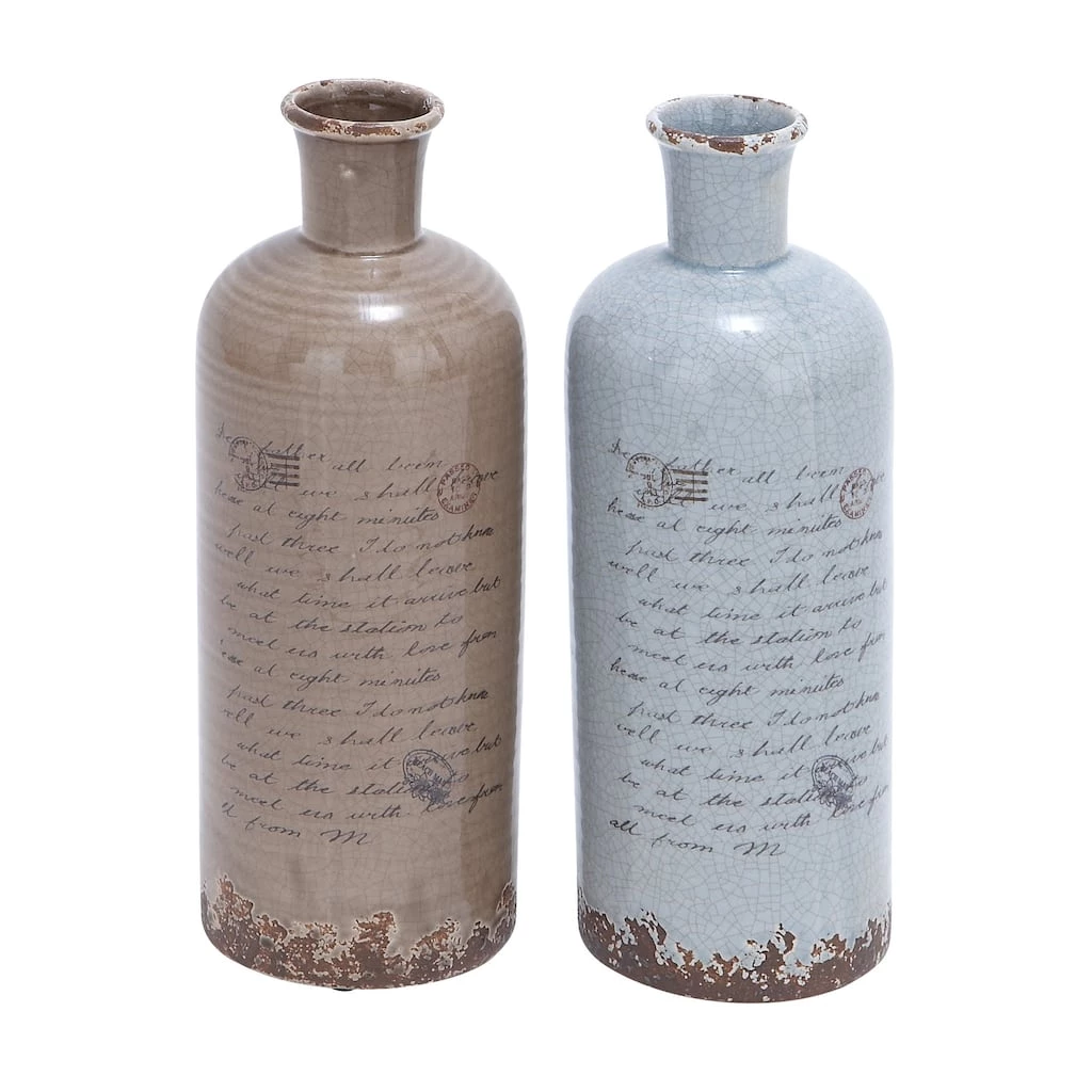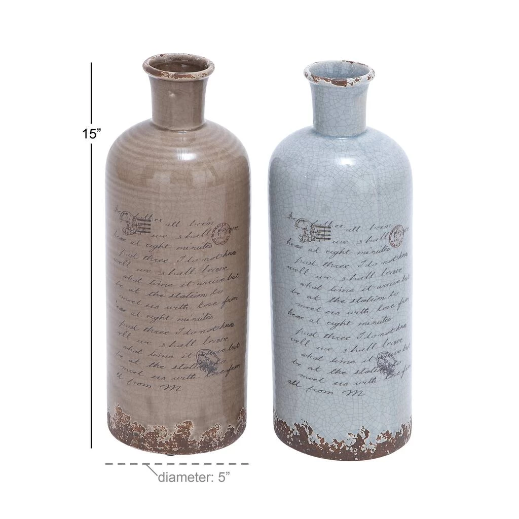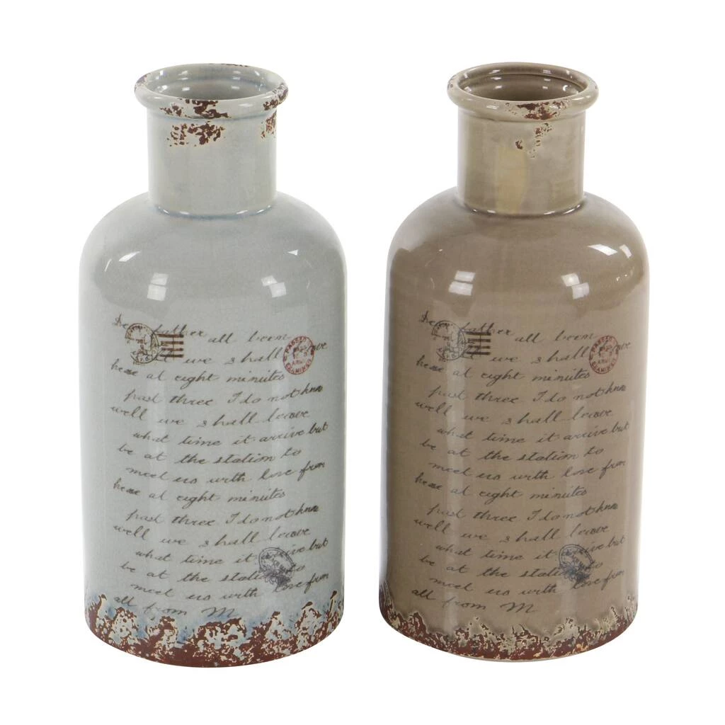 The post card letters on the surfaces of these light brown and blue ceramic bottle vases will stand the test of time. Treat your coastal or boho inspired homes with these interesting bottle-shaped ceramic vases featuring old post card letters printed on the surface. The vintage vibe brought by these vases will surely attract attention on table tops, or on your empty surfaces. Designed with black rubber stoppers at the base that prevent scratching furniture and table tops, as well as sliding around. This item ships in one carton. Suitable for indoor use only. This set includes 2 vases. Tapered neck cylinder vase with narrow rim opening. Vintage inspired.