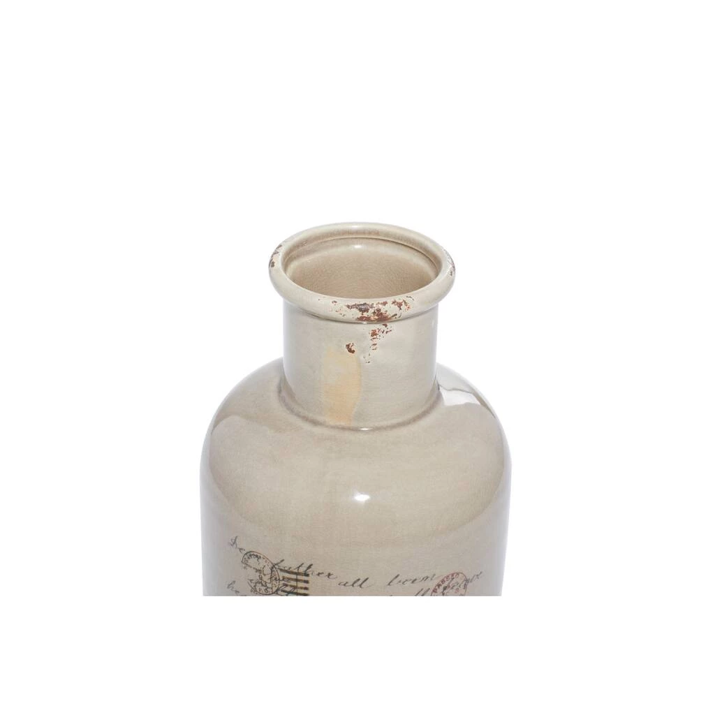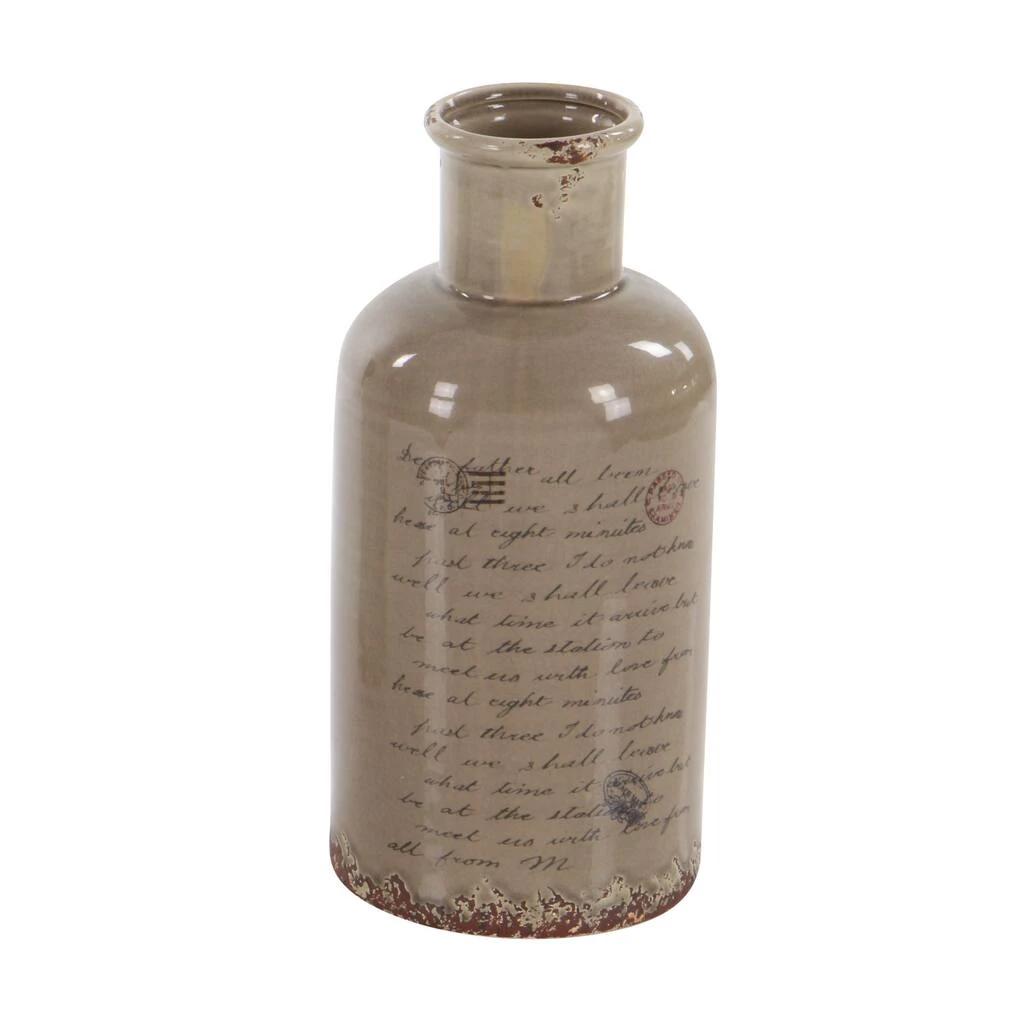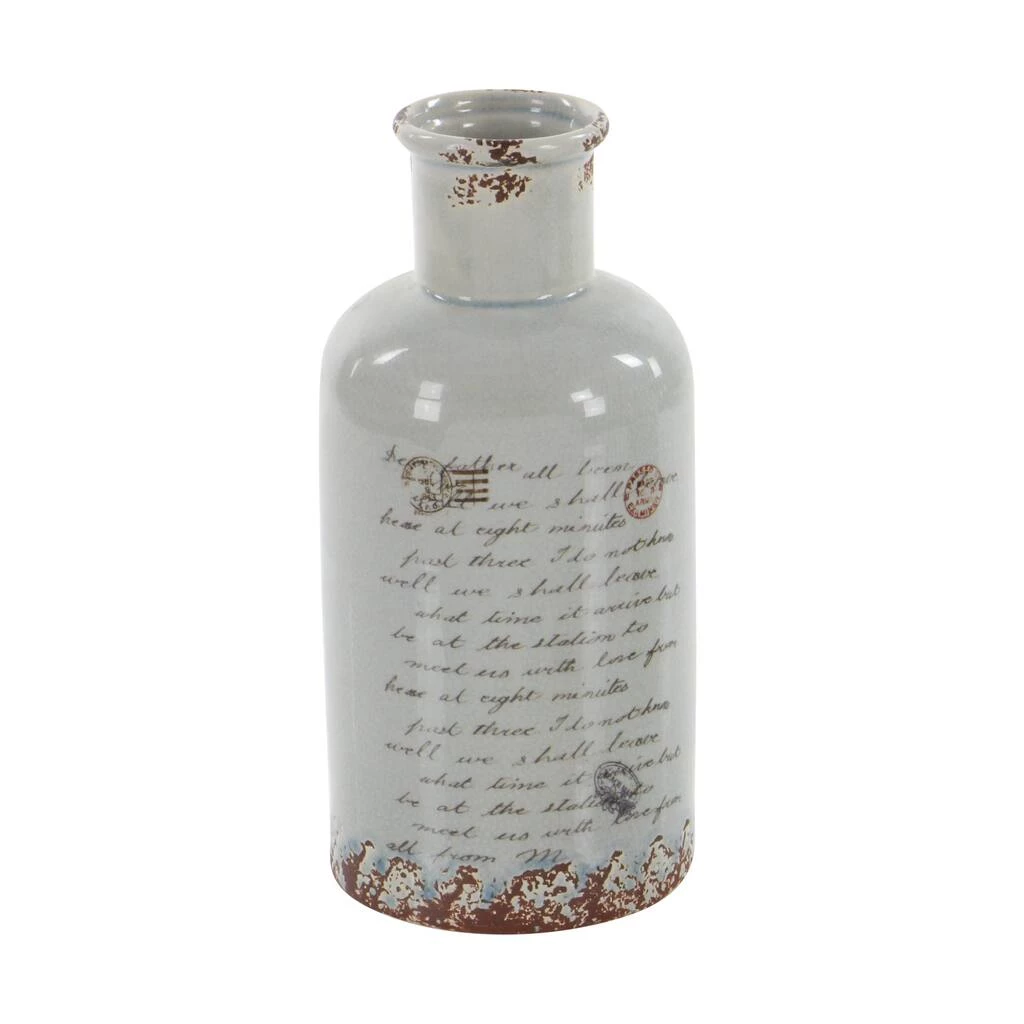 The post card letters on the surfaces of these light brown and blue ceramic bottle vases will stand the test of time. Treat your coastal or boho inspired homes with these interesting bottle-shaped ceramic vases featuring old post card letters printed on the surface. The vintage vibe brought by these vases will surely attract attention on table tops, or on your empty surfaces. Designed with black rubber stoppers at the base that prevent scratching furniture and table tops, as well as sliding around. This item ships in one carton. Suitable for indoor use only. This set includes 2 vases. Tapered neck cylinder vase with narrow rim opening. Vintage inspired.
