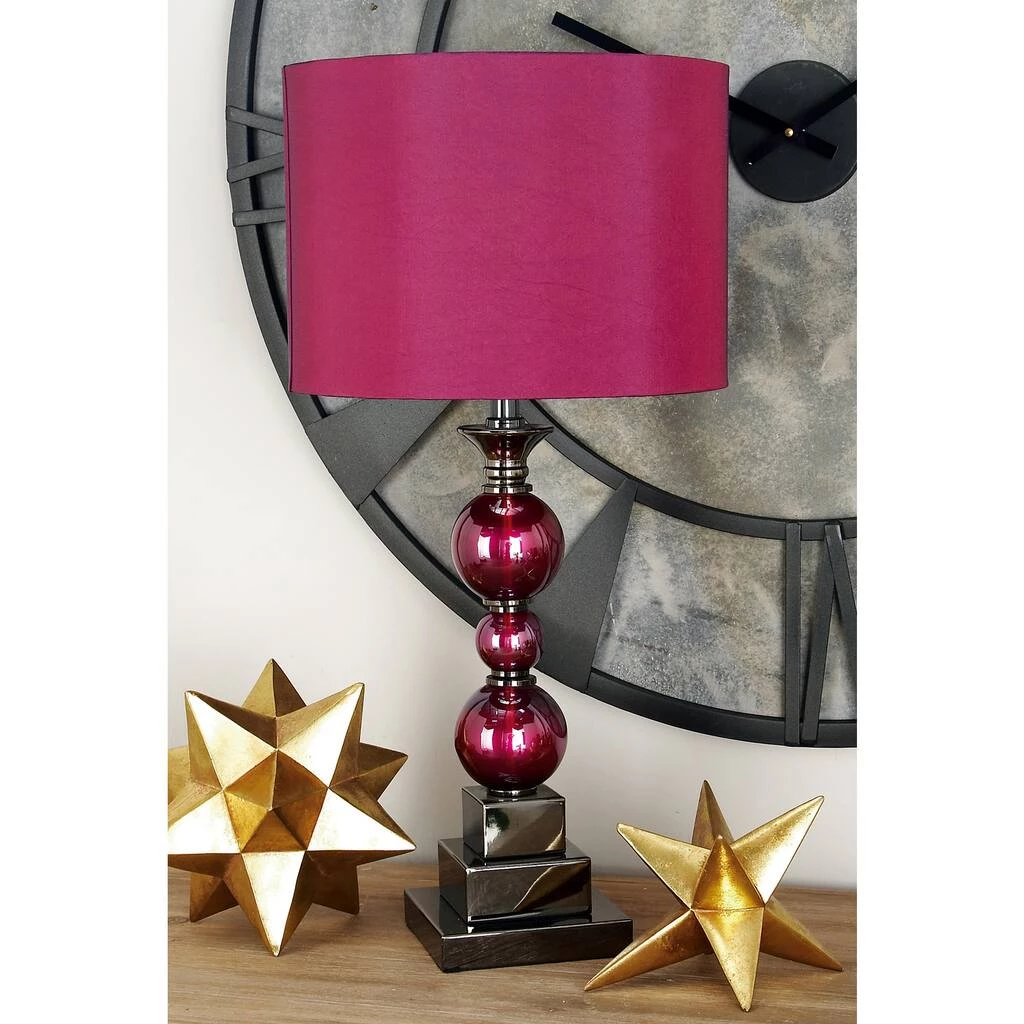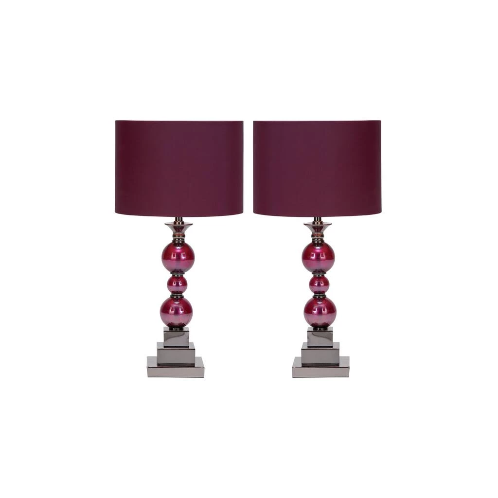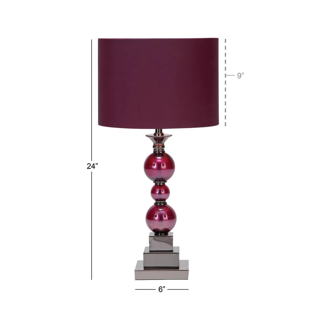 Brighten up any room to create a warming atmosphere for you and your guests with this chic table lamp. Make a statement with this unique lamp on mantle, console table or in any living space. This bubble table lamp will surely transform the ambiance of any home decor, especially in glam-inspired interior decoration. A socket for a medium-sized E26 bulb. Cord length is 63 inches. Suitable for indoor use only. Features purple drum fabric shade with 12βL x 8.50βH measurements, and has a slip UNO fitter. Comes with an on/off switch. Glam theme. Table lamps come in a set of 2. Designed with black rubber stoppers at the base that prevent scratching furniture and table tops, as well as sliding around. This item ship in one carton.