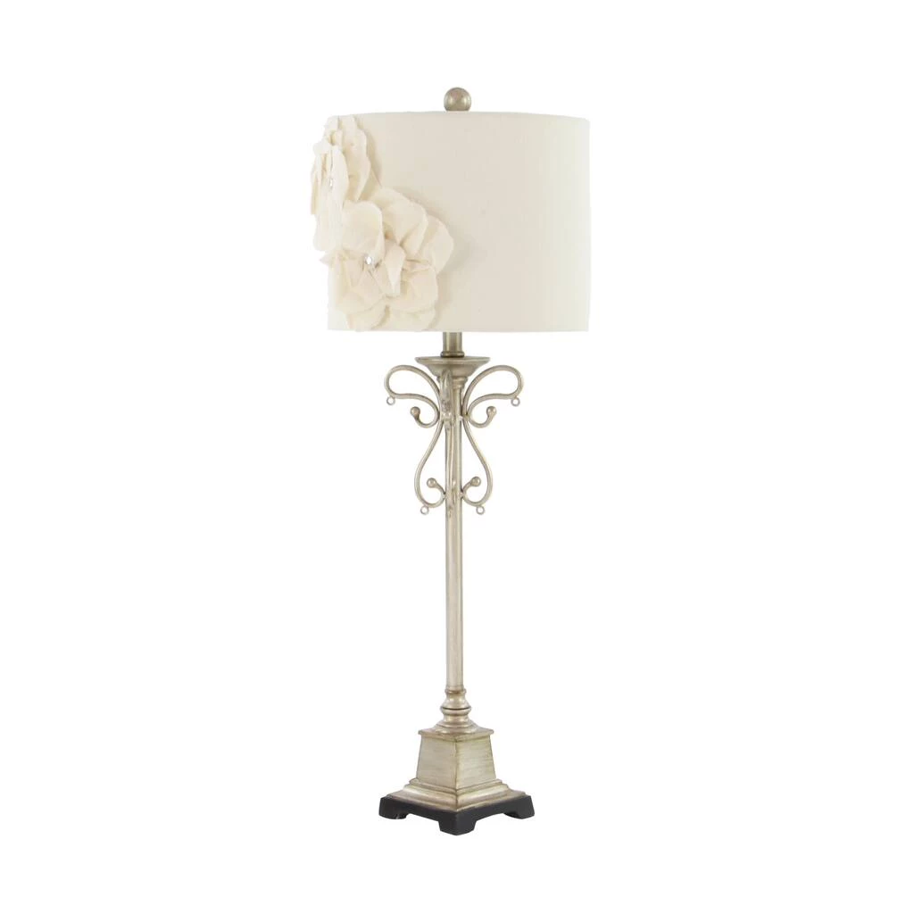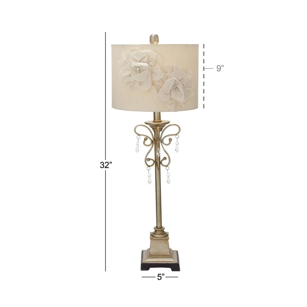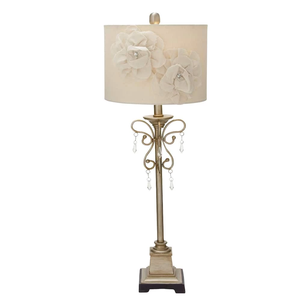 Rich in both romantic and elegant style, this tall silver metal buffet lamp features a serpentine scrolling post forming a butterfly silhouette with dangling clear teardrop crystal accents. The eggshell white colored linen lamp shade features large, dimensional linen flowers, each centered with a reflective clear rhinestone accent, making this accent decor a lovely centerpiece with ambient lighting in any room. Designed with black rubber stoppers at the base that prevent scratching furniture and table tops, as well as sliding around. Uses one 60-watt standard E26 medium bulb (not included). This item has a 62β cord length. Suitable for indoor use only. The tan buffet lamp is topped with a linen drum shade. This tall buffet lamp powers via an on/off switch. Glam theme. This item comes shipped in one carton.