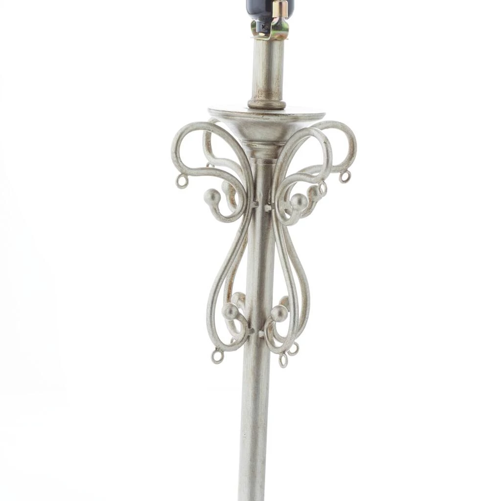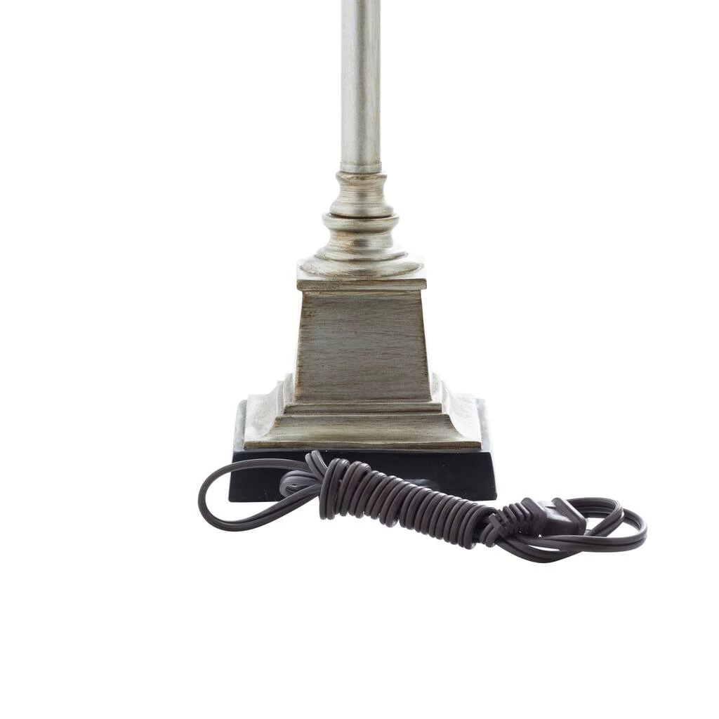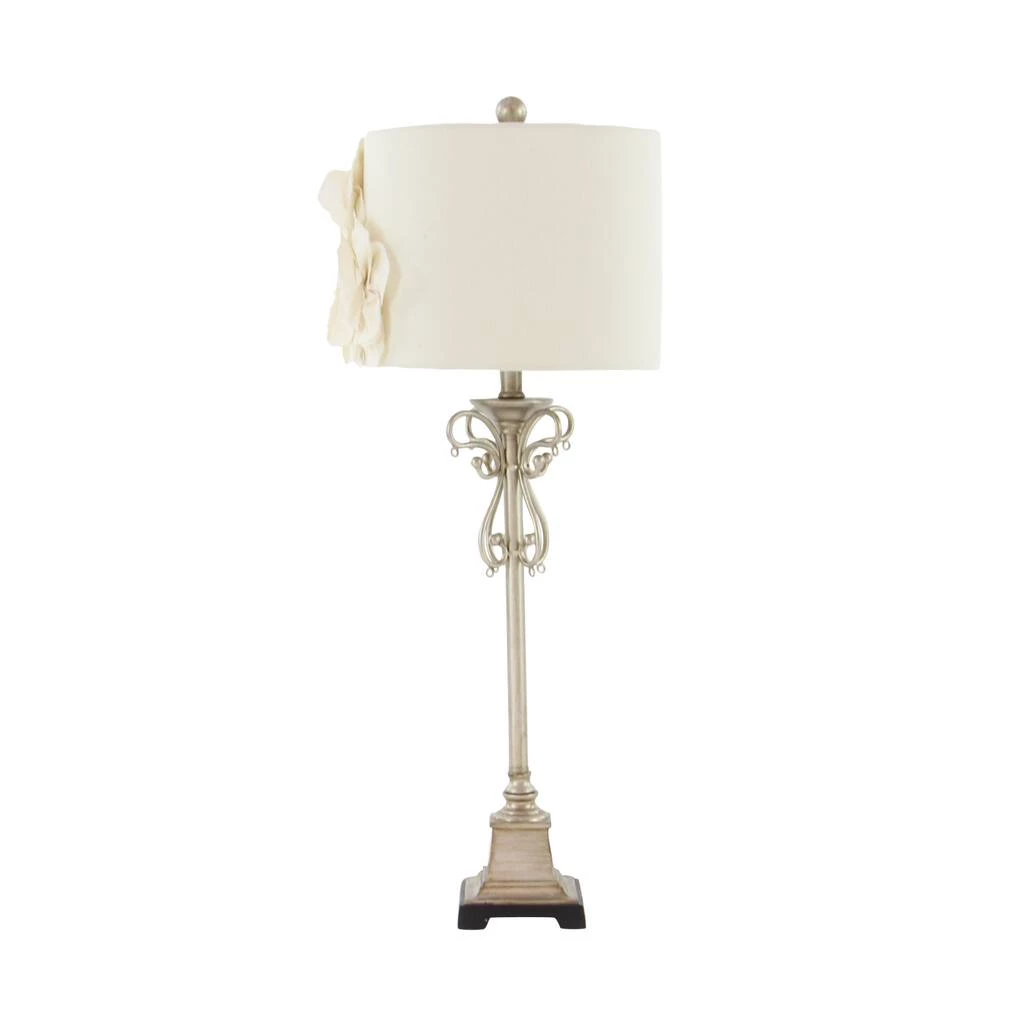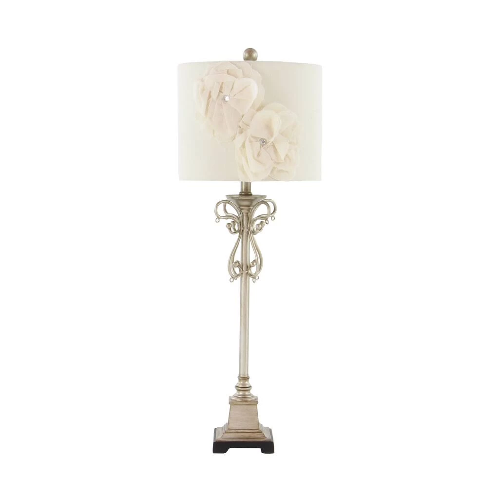 Rich in both romantic and elegant style, this tall silver metal buffet lamp features a serpentine scrolling post forming a butterfly silhouette with dangling clear teardrop crystal accents. The eggshell white colored linen lamp shade features large, dimensional linen flowers, each centered with a reflective clear rhinestone accent, making this accent decor a lovely centerpiece with ambient lighting in any room. Designed with black rubber stoppers at the base that prevent scratching furniture and table tops, as well as sliding around. Uses one 60-watt standard E26 medium bulb (not included). This item has a 62β cord length. Suitable for indoor use only. The tan buffet lamp is topped with a linen drum shade. This tall buffet lamp powers via an on/off switch. Glam theme. This item comes shipped in one carton.