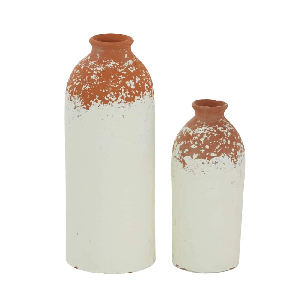 This is a two-piece set of jar-like porcelain vases that can serve multiple functions, as flower arrangement containers, small decor storage solutions, and stand-alone decorative pieces on top of natural and coastal themed dressers, side and center tables, and shelves. They carry the old milk bottle silhouette and distressed orange rims. Suitable for indoor use only. Vases do not have drainage holes. This set of Chinaware vases feature a 1. 50″D and 1. 30″D mouth openings. This set includes 2 vases. This item comes shipped in one carton.