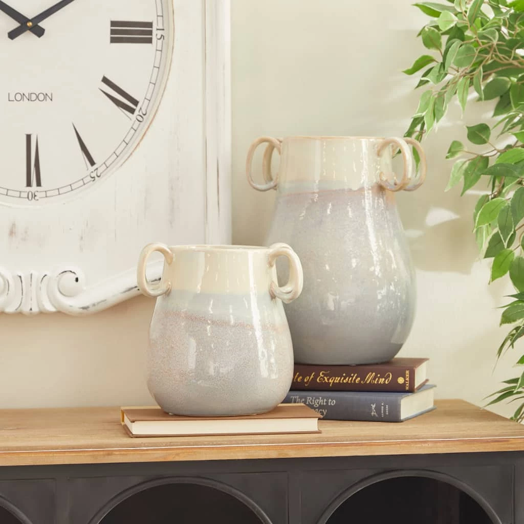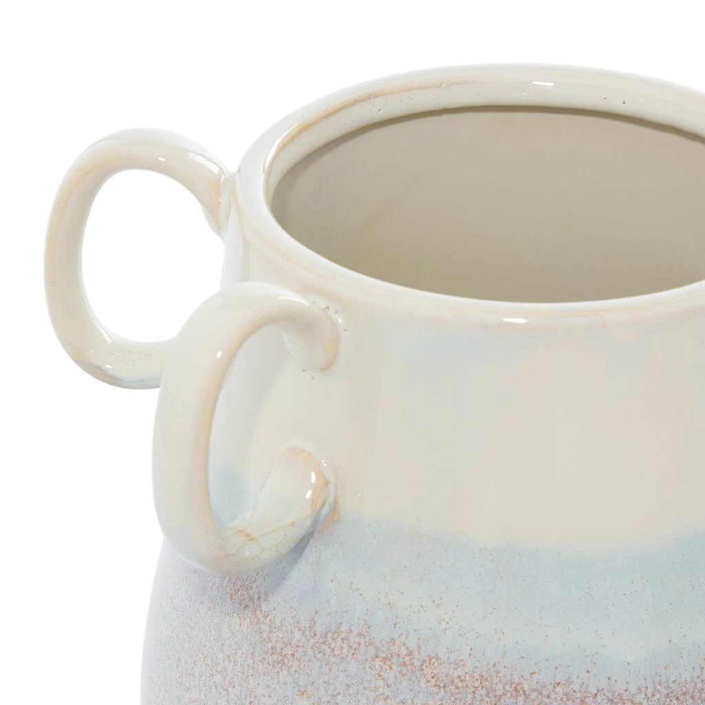 Embrace the country cottage charm with these half-dipped white and blue ceramic amphora vases. Made with ceramic, each vase flaunts a chalk blue body finish over pearl white shoulder finish. These half-dipped vases also highlight 4 conveniently placed ear handles. Placed as standalone or as set of 2 on your coffee or console table, these ceramic vases creates a warm and cozy vibe in your country cottage-themed home spaces. This item ships in one carton. Suitable for indoor use only. This set includes 2 vases. Amphora vases with wide rim openings. Farmhouse-themed style.