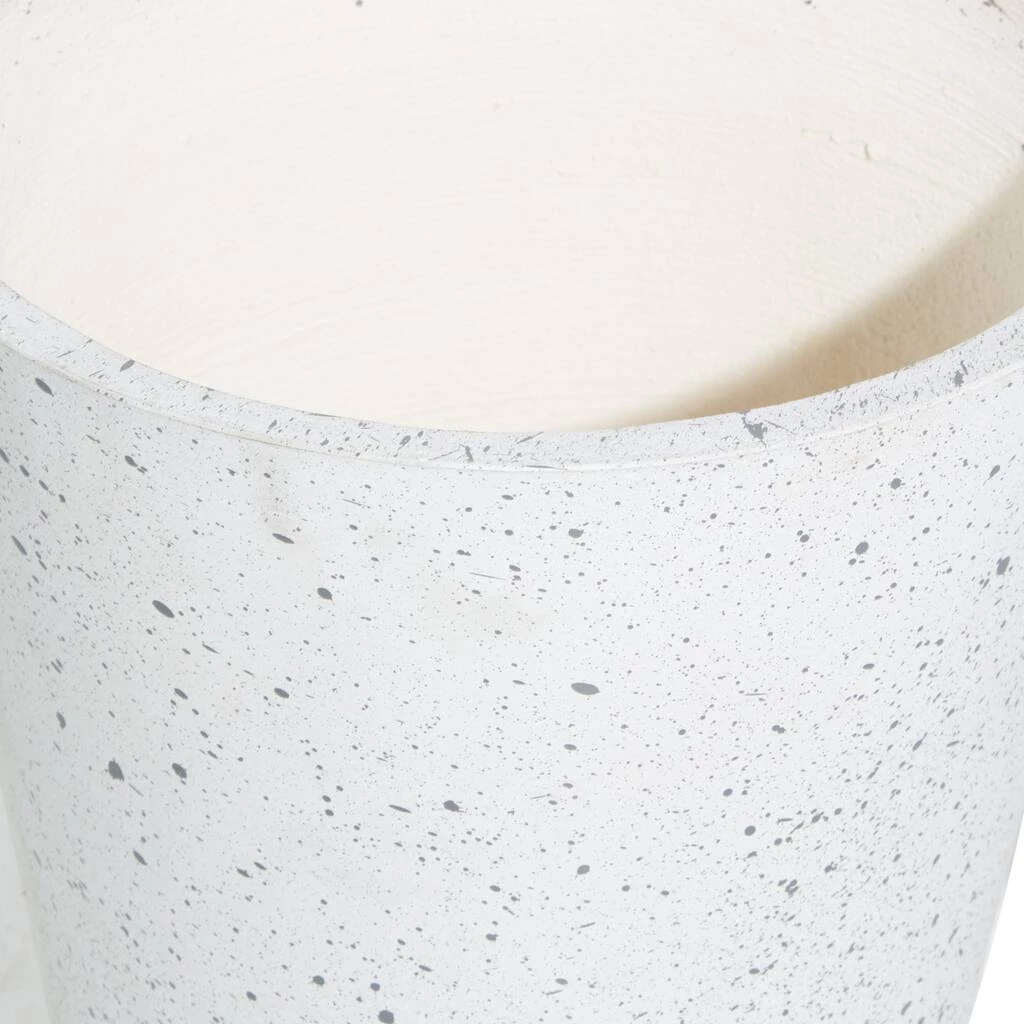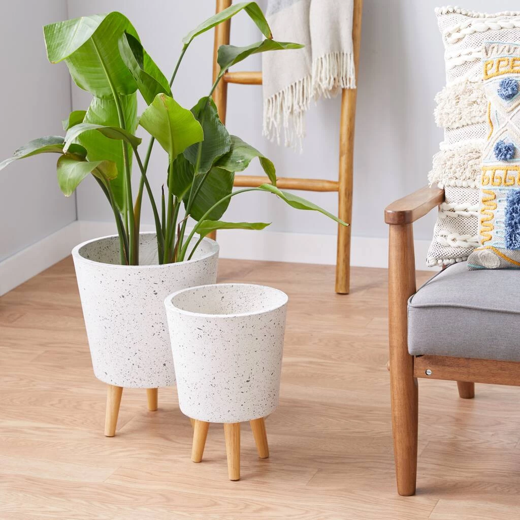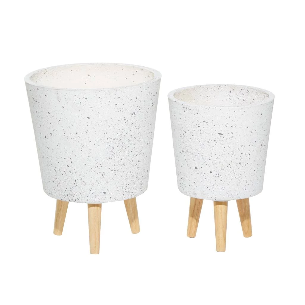 Create a chic and e-co friendly home by Incorporating some greenery in your living space, this truncated cone shaped white marble textured fiber clay set of two planters will help you achieve that goal. The fiber clay construction of this planter means toughness without sacrificing beauty and elegance thanks to its unique truncated cone 3D geometric structure. The entire piece rests on a wooden tripod leg design with circular wooden legs in a light brown hue. This planter set will bring a much-needed freshness with indoor plants in your chic style living space. Recommended for use with indoor plants that do not require much water or sunlight, since there is no drainage hole. This item ships in one carton.