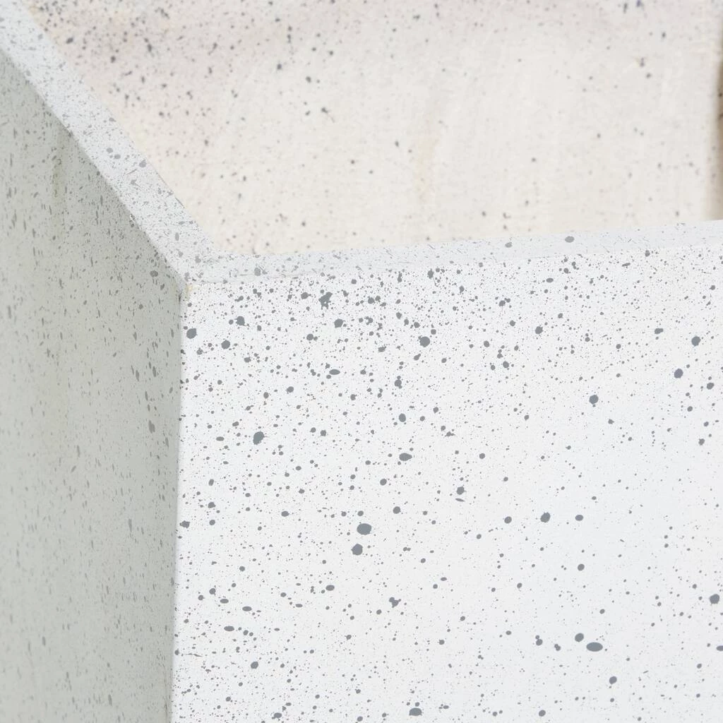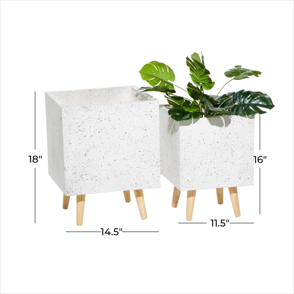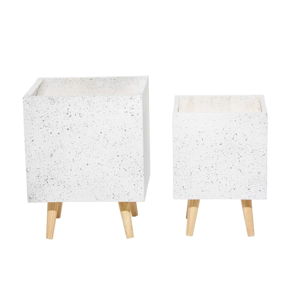 Add a fresh bit of stylish greenery in your chic inspired living space with this two piece set white marble textured fiber clay planters. This fiber clay-made planter features a unique cube-shaped design in a beautiful white marble texture finish. The planter stands comfortably via a wooden tripod design in a charming light brown hue. This geometric planter set will bring a much-needed freshness into any living space, it will also help add depth and balance any space in your home. Recommended for use with indoor plants that do not require much water or sunlight, since there is no drainage hole. This item ships in one carton.