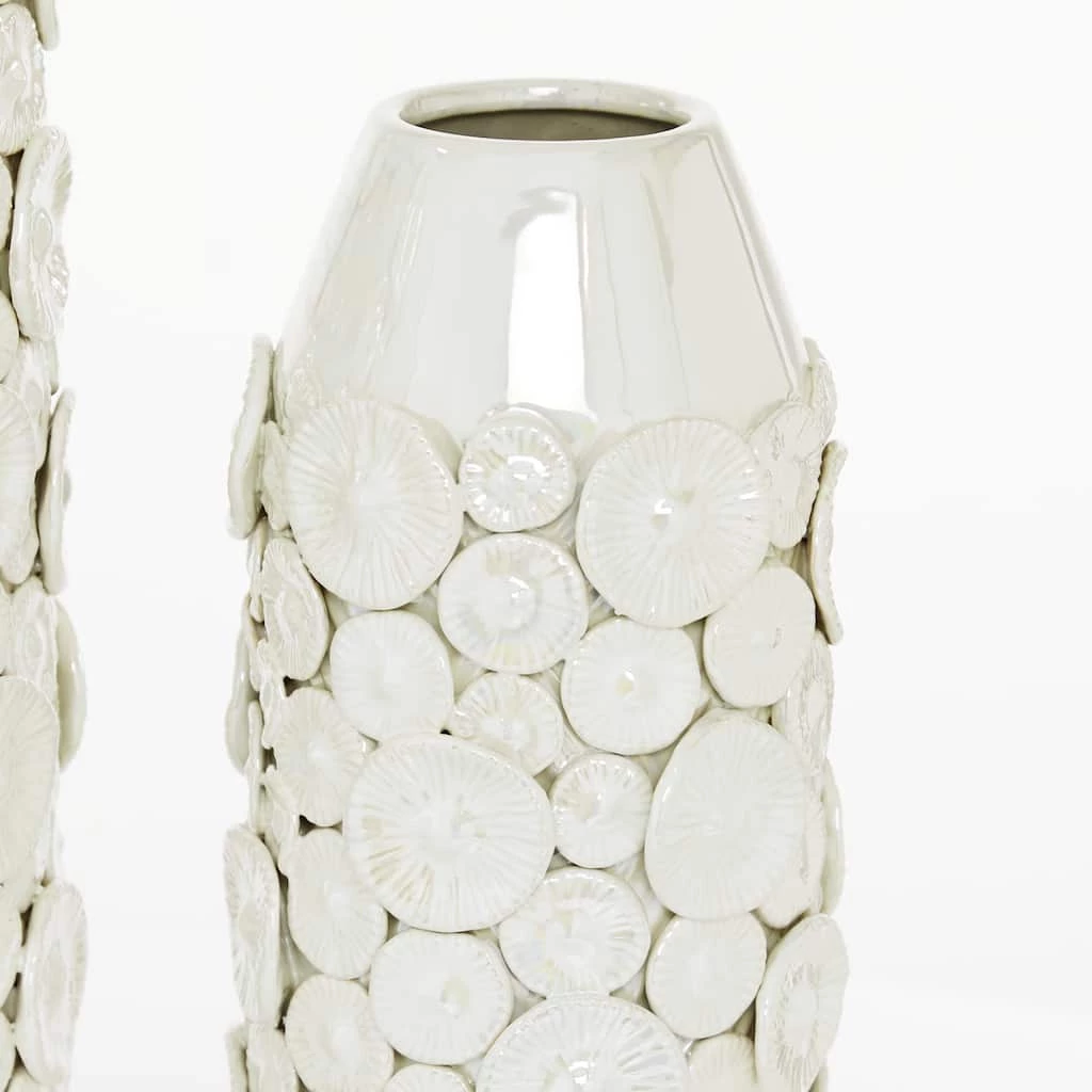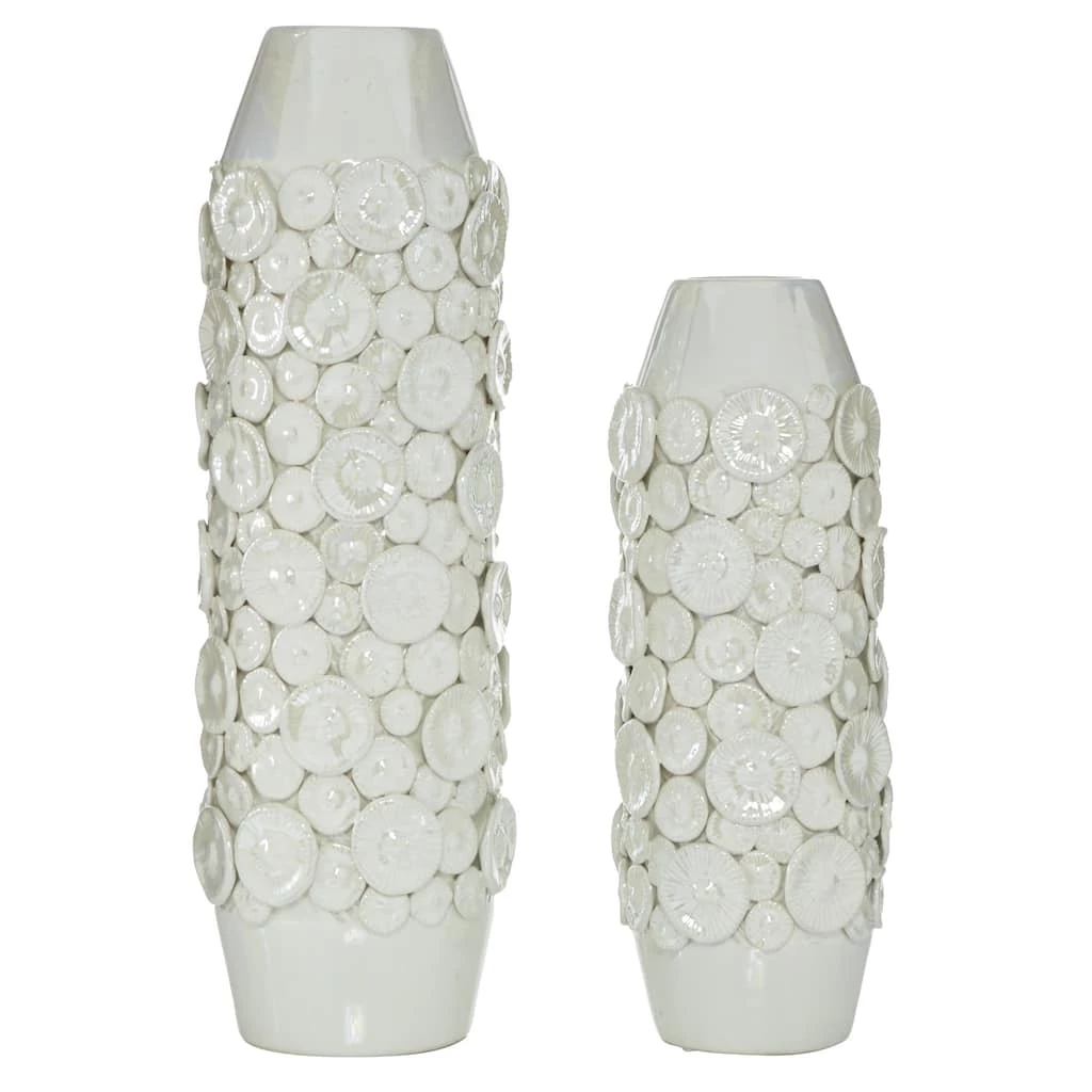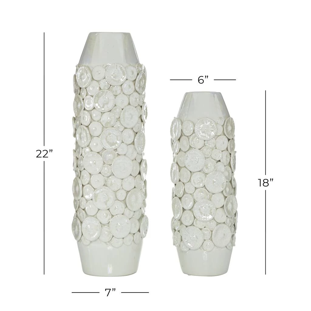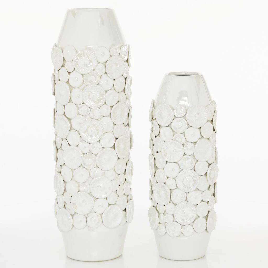 This is a white ceramic vase set with a sand dollar pattern on the shaft and made from stoneware. You can display them in modern interior settings, put flowers in them, or use them as stand-alone tabletop decorations. They also capture attention on top of wall dressers, in shelves, and next to wall mirrors. . Suitable for indoor use only. This ceramic vase set do not have drain holes. These ceramic vases have 3″and 4″ mouth openings. This set include 2 vases. This item comes shipped in one carton.