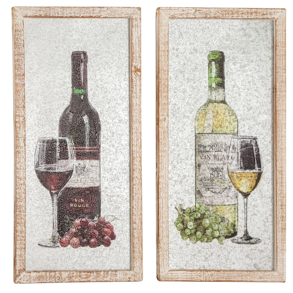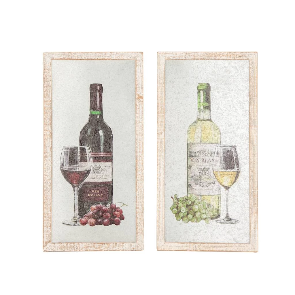 Add a spark of elegance to dull home interiors with this set of wood and metal wall decors. The pair of wall art features wine bottles with glass and grapes. These are then framed in Chinese fir and MDF wood with a distressed whitewashed finish, creating stunning natural wall art. The botanical theme of the wall decors amplifies the warm and cozy ambiance of farmhouse and natural style homes. Uses D-rings at the back to securely hang the prints. Suitable for indoor use only. This is a 2-in-1 set of framed wine wall decorations. This item comes shipped in one carton.