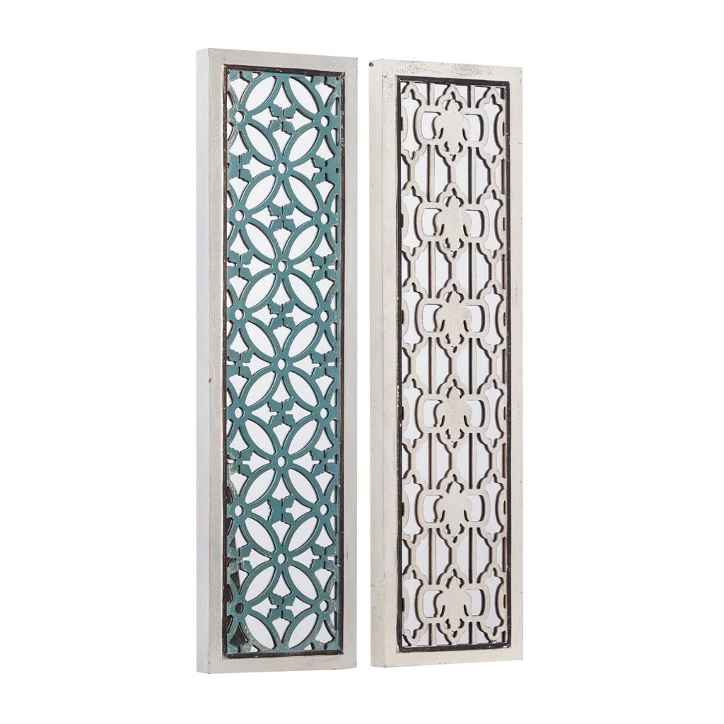 You donβt need to take a day off to decorate and make your walls look great. Make your home exceptional in an hour with this set of rectangular framed mirror wall panels. Each wall panel features a glass mirror with white frame and decorative cut-out trellis pattern overlay. These lovely wall panels suit glam styled interior that crave for stylish home decoration. Hang this duo together or you can display them in different areas of your home to bring a relaxing ambiance while adding a glam atmosphere to your space. These items hang vertically via D-ring hardware. Suitable for indoor use only. These wall panels come as a set of 2. This item comes shipped in one carton.