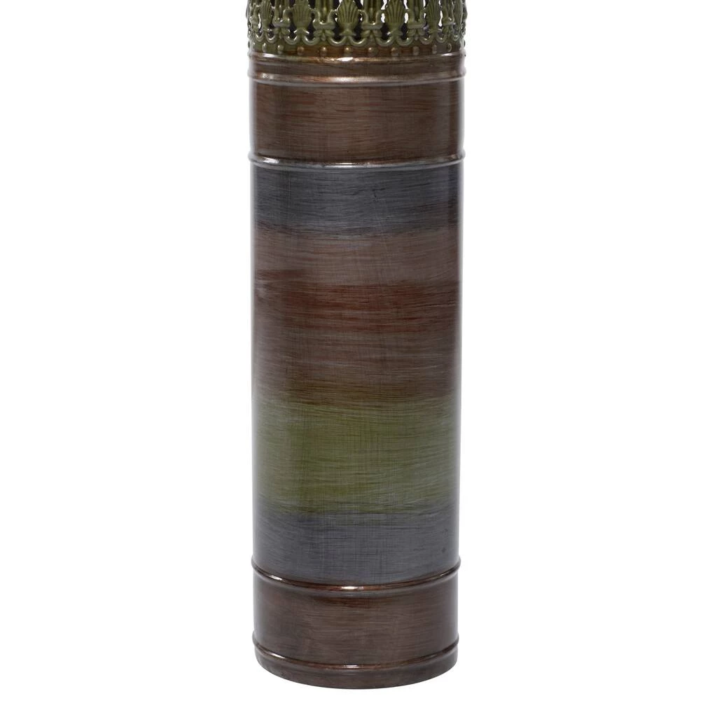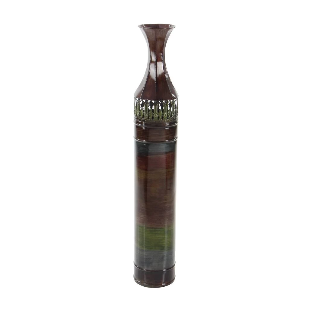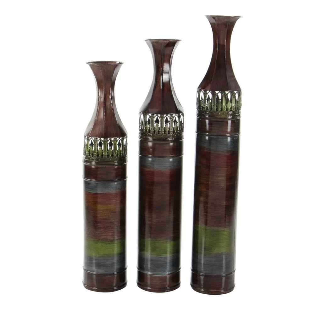 This brown metal cylindrical ombre vase set will definitely be a hit in your contemporary setting home. This set of three vases feature a fluted design and are finished with glossy multi-colored finish neutral cool tones. Each vase also features an ornate decorative pattern on the collar for an additional unique touch. Display together as a set on a tabletop or open shelf, or place throughout your home with your favorite decor for added style dimension. Suitable for indoor use only. This set of iron vases all feature a 4″D mouth opening. This set includes 3 vases. This item comes shipped in one carton. Traditional style.