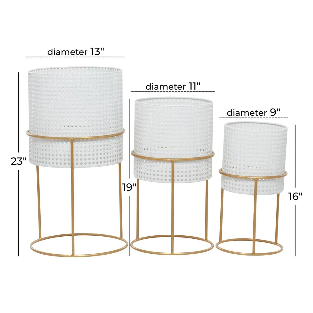 The simple yet bold design of this set of planters makes it an instant conversation piece and a gorgeous accent decor for your home. A smart chic style inspired living space knows how important mixing and matching is, especially when it comes to adding some greenery in your space. Enhance the mood and the look of your room with some plants in this beautifully designed planter. This item comes shipped in one carton. Each cylindrical pot is pierced repeatedly to create eye-catching and unique perforated pattern. Suitable for indoor use. Pots do not have drainage holes. This set comes with 3 metal planters. Contemporary Inspired.