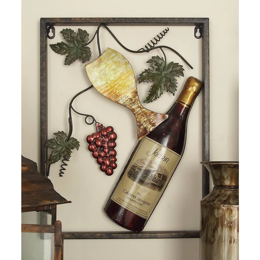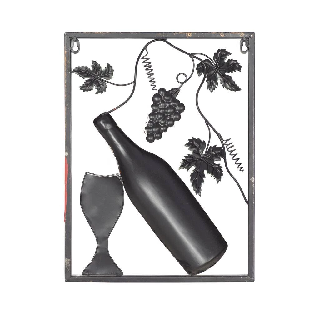 These traditional style inspired design metal wine decors will work excellently as a set or individually especially in the kitchen, dining room, cellar, or bar. Wine enthusiasts will love this set of metal wall art. The set includes four wine themed designs in open rectangular frames. Each design is made of iron but features a colorful finish and textured surfaces. Admire the wall artβs bottles, grapes, and goblets as you and your guests sip beverages in your dining room or home bar. All four frames feature keyhole hangers for easy hanging. The art will complement other traditional-style decor. Items are ready to hang by keyhole slots in the back. This item comes shipped in one carton. Traditional style.